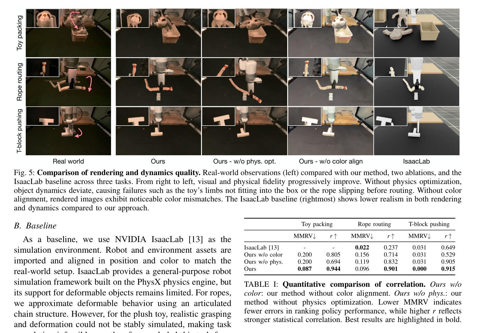现实世界中机器人操作策略的直接评估成本高昂、耗时长且难以重现,特别是在涉及可变形物体的任务中。仿真提供了一种可扩展和系统的替代方案,但现有仿真器往往无法捕捉软体交互的复杂视觉和物理特性。我们提出一种从现实到仿真的策略评估框架,通过构建软体数字双胞胎模拟真实世界视频中的机器人、物体和环境,使用三维高斯绘图实现逼真渲染。在典型的可变形操作任务中验证了我们的方法,包括填充毛绒玩具、线路铺设和T块推动等任务,证明模拟运行结果与真实世界执行性能高度相关,并揭示了学习策略的关键行为模式。我们的结果表明,结合物理信息重建和高品质渲染可实现机器人操作策略的可重现、可扩展和准确评估。