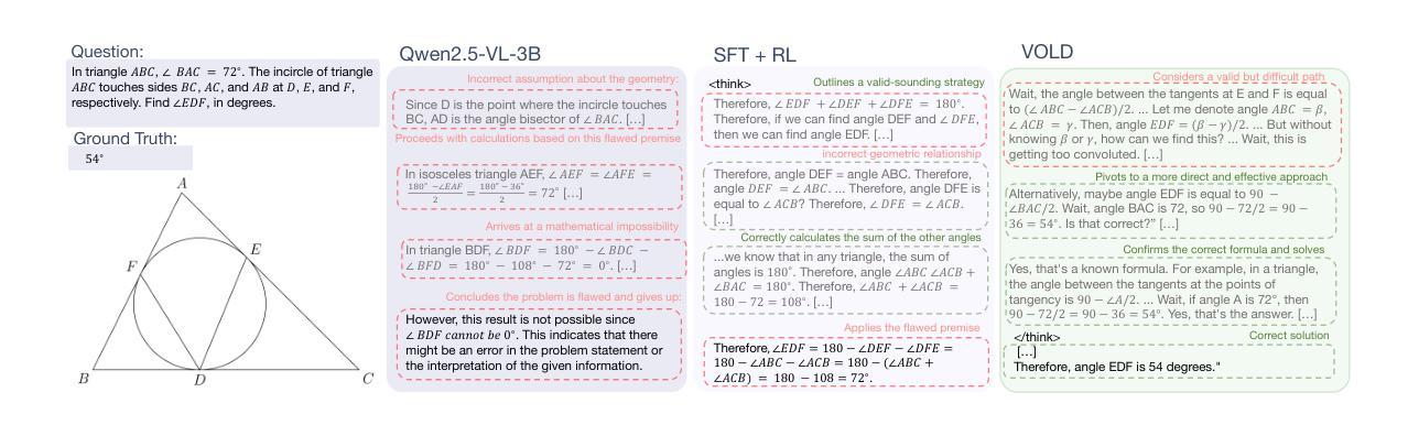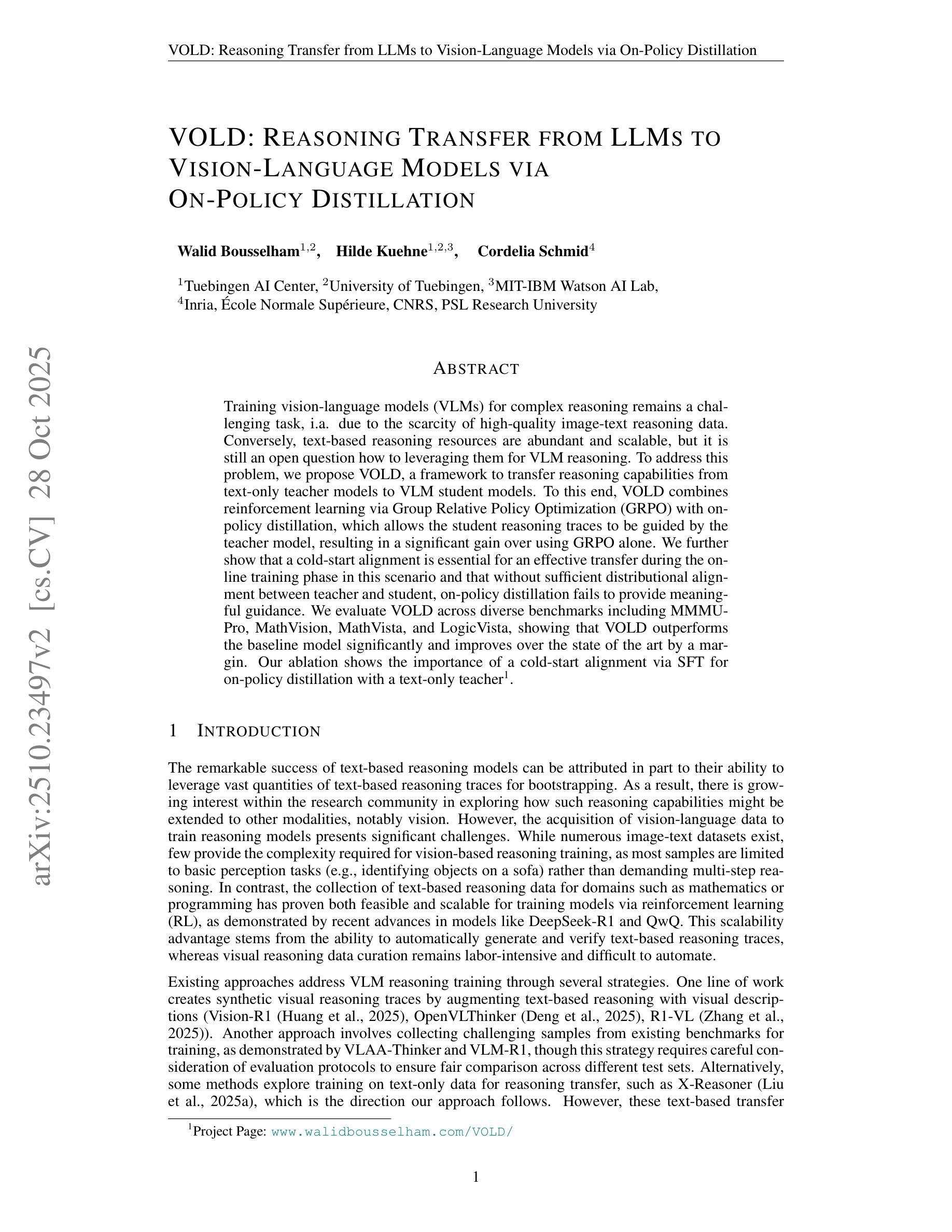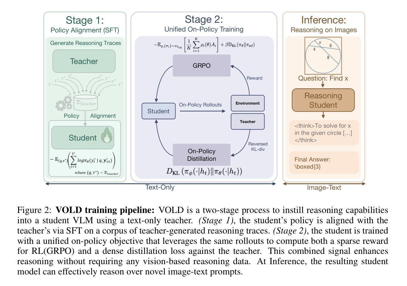 训练用于复杂推理的视觉语言模型(VLM)仍然是一项具有挑战性的任务,尤其是因为高质量的图文推理数据稀缺。相反,基于文本推理的资源丰富且可扩展。然而,如何利用这些资源用于VLM推理仍然是一个悬而未决的问题。为了解决这个问题,我们提出了VOLD框架,该框架可以将仅基于文本的教师模型的推理能力转移到VLM学生模型。为此,VOLD结合了通过群体相对策略优化(GRPO)的强化学习与基于策略的蒸馏,这允许学生推理轨迹受到教师模型的指导,与仅使用GRPO相比,这带来了显着的收益。我们进一步表明,在此场景中,在线训练阶段有效的转移过程中冷启动对齐至关重要,并且在教师和学生之间缺乏足够的分布对齐会导致基于策略的蒸馏无法提供有意义的指导。我们在包括MMMU-Pro、MathVision、MathVista和LogicVista等多种基准测试上对VOLD进行了评估,结果表明VOLD显著优于基准模型,并以一定幅度提高了现有技术水平。我们的消融研究显示了使用仅基于文本的教师进行策略蒸馏时,通过SFT进行冷启动对齐的重要性。