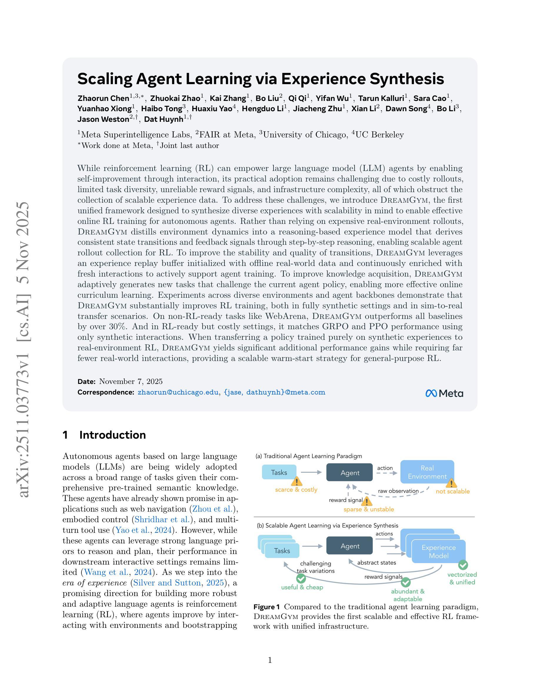 强化学习(RL)可以通过交互使大型语言模型(LLM)实现自我提升,从而增强其能力,但其在实践中的采纳仍面临挑战,包括成本高昂的滚动操作、任务多样性有限、奖励信号不可靠以及基础设施复杂性等,这些都阻碍了可扩展经验数据的收集。为了应对这些挑战,我们推出了DreamGym,这是第一个统一框架,旨在通过合成多样化的经验并考虑可扩展性,以实现对自主代理进行有效在线RL训练。DreamGym不依赖于昂贵的真实环境滚动操作,而是将环境动态性提炼成基于推理的经验模型,通过逐步推理来得出一致的状态转换和反馈信号,从而实现可扩展的代理滚动收集用于RL。为了提高转换的稳定性和质量,DreamGym利用初始化为离线真实世界数据的经验回放缓冲区,并不断丰富新鲜交互以积极支持代理训练。为了提高知识获取能力,DreamGym自适应生成新任务以挑战当前代理策略,从而实现更有效的在线课程学习。在多种环境和代理骨架上的实验表明,DreamGym在完全合成设置和模拟到真实转移场景中均显著改进了RL训练。在非RL准备任务(如WebArena)上,DreamGym的基线性能优于所有基线30%以上。在RL就绪但成本高昂的环境中,它仅使用合成交互即可与GRPO和PPO性能相匹配。当将仅基于合成经验训练的策略转移到真实环境的RL时,DreamGym在需要更少的真实世界交互的情况下实现了显著的性能提升,为通用RL提供了一个可扩展的预热启动策略。