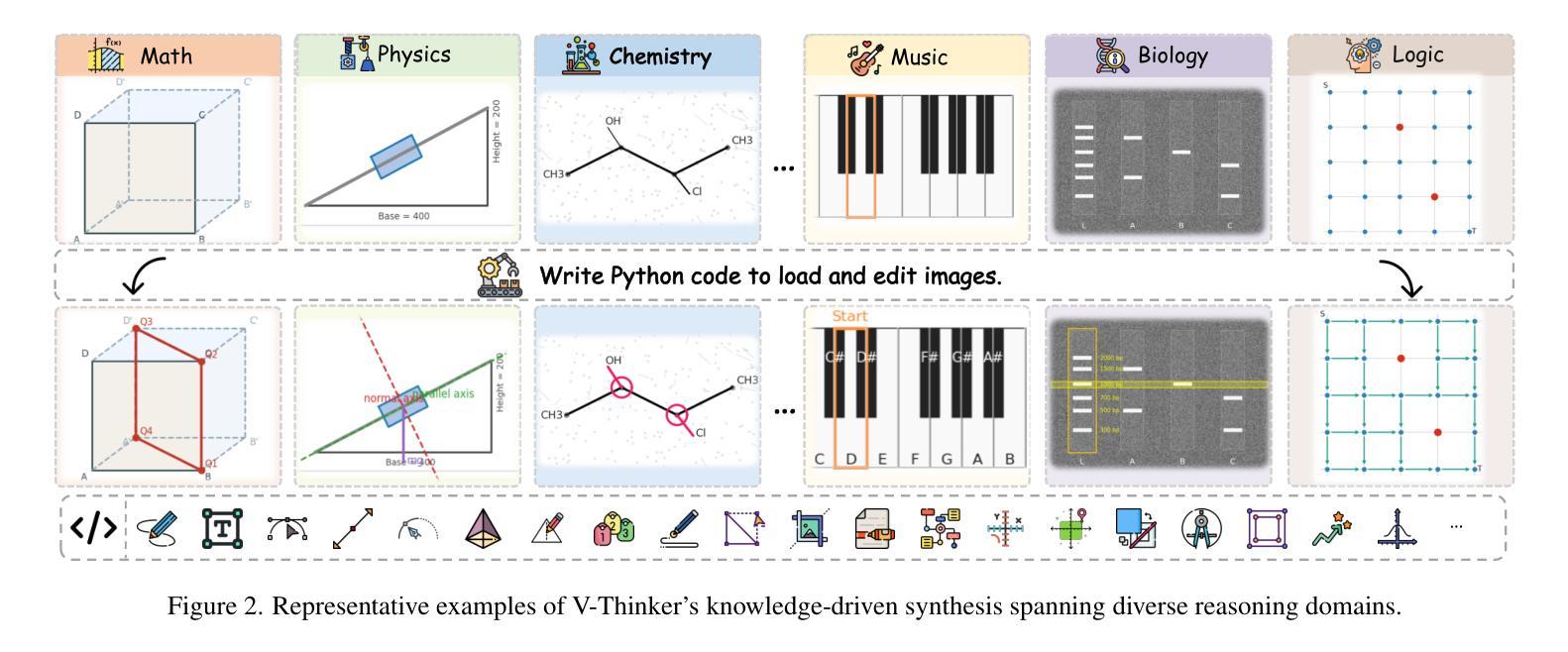 在赋能大型多模态模型(LMMs)方面,通过整合图像交互与长期推理能力仍存在挑战。近期在视觉为中心(Vision-centric)的推理研究中,出现了为LMMs的“图文思维”范式。此突破虽然能使模型关注于图像细节区域,但仍受限于有限的视觉工具空间和任务特定的工作流程设计。为此,我们推出V-Thinker,一种通用多模态推理助手,通过端到端的强化学习实现交互式、视觉为中心的思考。其包括两个关键组成部分:(一)数据进化飞轮(Data Evolution Flywheel),它能自动合成、演变和验证跨越三个维度的交互式推理数据集;(二)视觉渐进训练课程(Visual Progressive Training Curriculum),它首先通过点对点监督对齐感知,然后通过两阶段强化学习框架整合交互式推理。此外,我们还推出了VTBench专家验证基准测试,针对视觉为中心交互式推理任务。实验证明,V-Thinker在一般和交互式推理场景中均优于强大的LMM基线模型,为推进图像交互推理应用提供了宝贵见解。