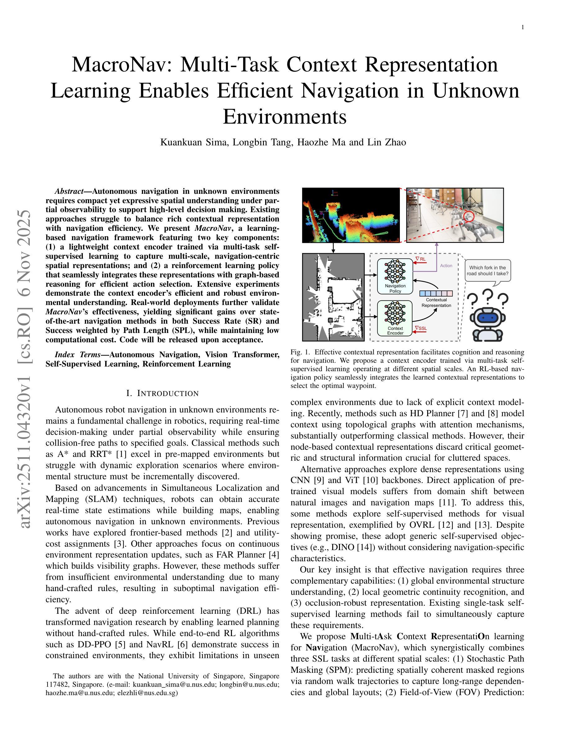 在未知环境中进行自主导航,需要在部分可观察性的情况下,具备紧凑而富有表现力的空间理解能力,以支持高级决策制定。现有方法很难在丰富的上下文表示和导航效率之间取得平衡。我们提出了MacroNav,这是一个基于学习的导航框架,包含两个关键组件:(1)通过多任务自我监督学习训练的一个轻量级上下文编码器,用于捕获多尺度、以导航为中心的空间表示;(2)一种强化学习策略,无缝集成这些表示与基于图的推理,以实现高效的行动选择。大量实验证明了上下文编码器对环境的理解和鲁棒性。在现实世界的部署中进一步验证了MacroNav的有效性,其在成功率和路径长度加权成功率方面均优于最新导航方法,同时保持较低的计算成本。代码在验收通过后发布。