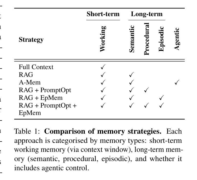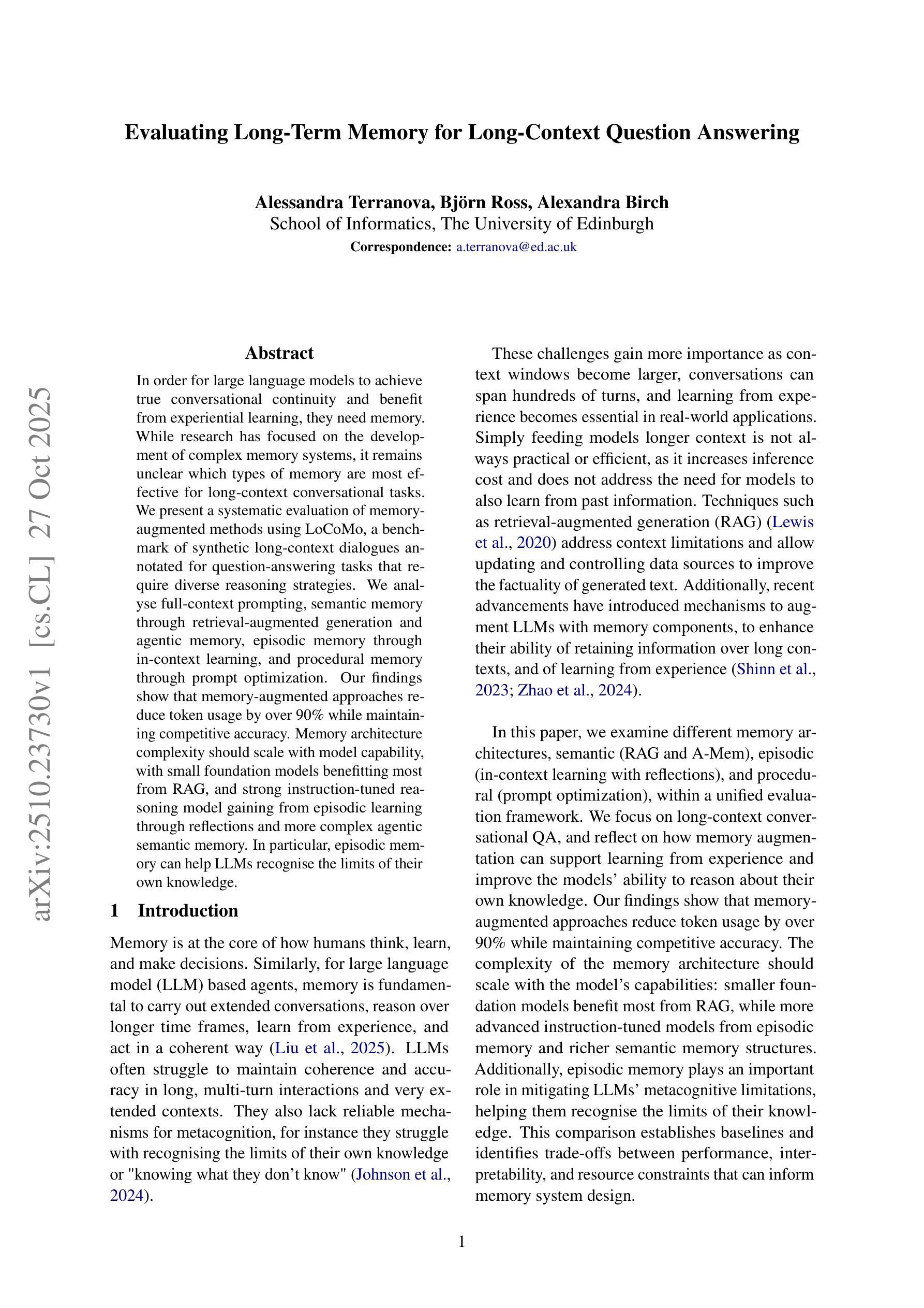 大型语言模型要实现真正的对话连续性和从经验学习中受益,需要记忆力的支持。研究已关注复杂记忆系统的发展,但对于长语境对话任务,尚不清楚哪种类型的记忆最为有效。本文通过LoCoMo基准测试,对记忆增强方法进行了系统评估,包括全语境提示、通过检索增强生成实现的语义记忆和自主记忆、通过上下文学习实现的情景记忆以及通过提示优化实现的程序性记忆。研究发现,记忆增强方法可在减少令牌使用的同时保持竞争力;记忆架构的复杂性应随模型能力的增强而扩展,小型基础模型最受益于RAG,而强大的指令调优推理模型则受益于通过反思和更复杂的自主语义记忆的情景学习。特别是情景记忆有助于LLM识别自身知识的局限性。