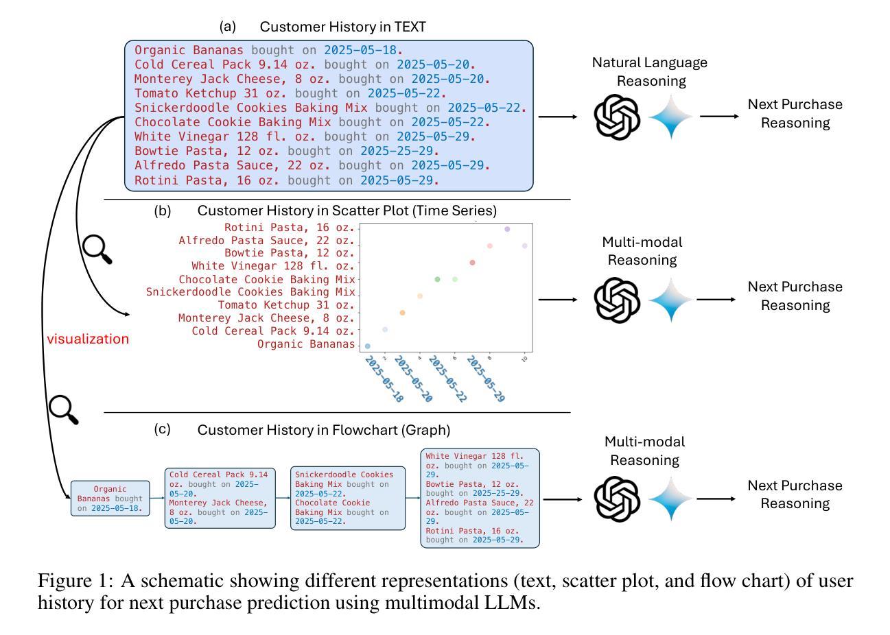 BehaviorLens,这是一个系统的基准测试框架,用于评估在六个MLLM中进行用户行为推理时的模态权衡。我们通过三种方式表示交易数据:(1)一段文本,(2)散点图,(3)流程图。通过使用现实世界的购买序列数据集,我们发现当数据以图像形式表示时,与等效的文本表示相比,MLLM的下次购买预测精度提高了87.5%,且没有任何额外的计算成本。