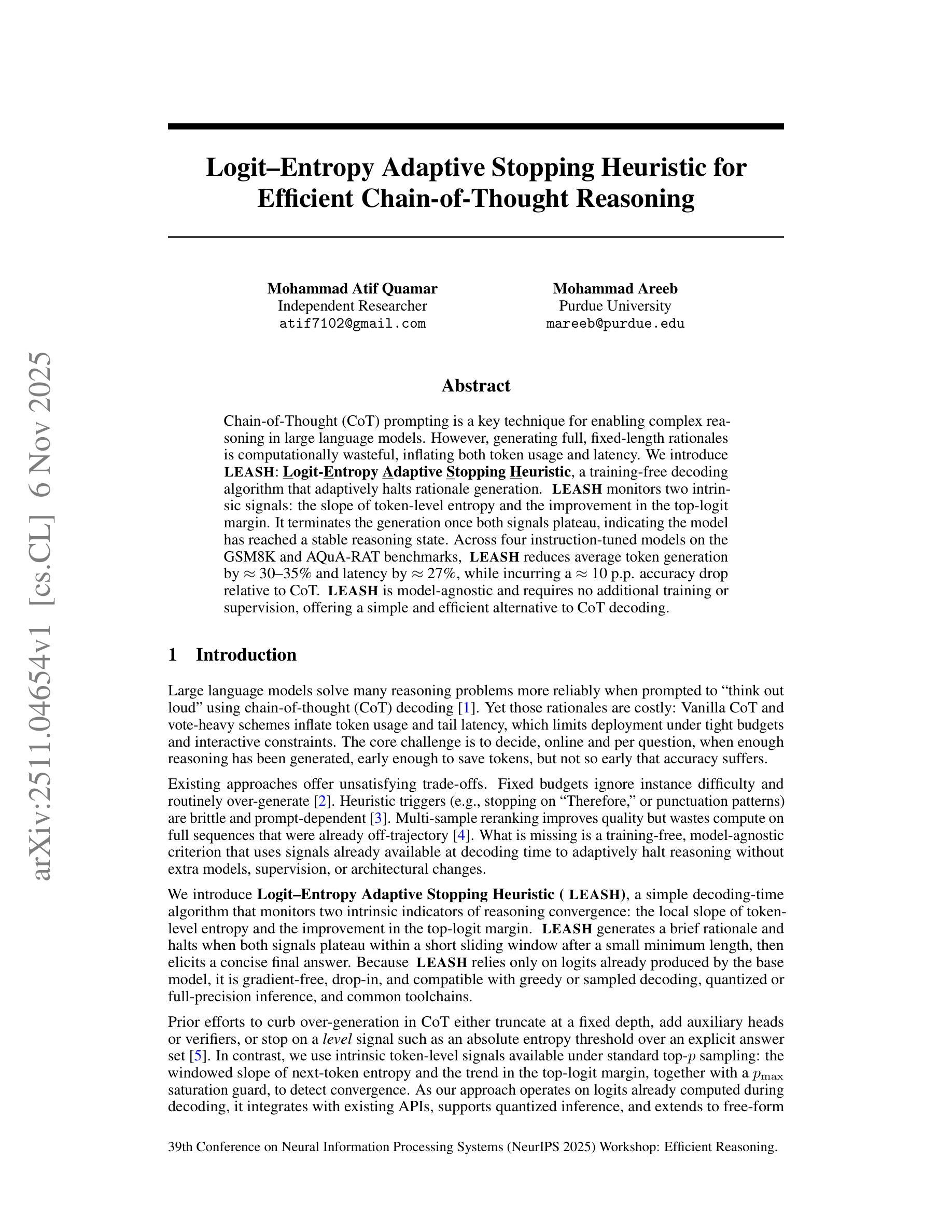 链式思维(Chain-of-Thought,简称CoT)提示是大型语言模型中实现复杂推理的关键技术。然而,生成完整、固定长度的理由在计算上是浪费的,增加了令牌使用量和延迟。我们引入了LEASH:无需训练的解码算法——对数熵自适应停止启发式方法,该方法可以自适应地终止理由生成。LEASH监控两个内在信号:令牌级别的熵斜率和顶部对数边界的改善情况。一旦这两个信号达到平稳状态,即表示模型已经到达稳定的推理状态,此时便会终止生成。在GSM8K和AQuA-RAT基准测试的四个指令调优模型中,LEASH将平均令牌生成量减少了30-35%,延迟减少了27%,相对于CoT,准确率下降了10个百分点。LEASH具有模型无关性,无需额外的训练或监督,为CoT解码提供了简单高效的替代方案。