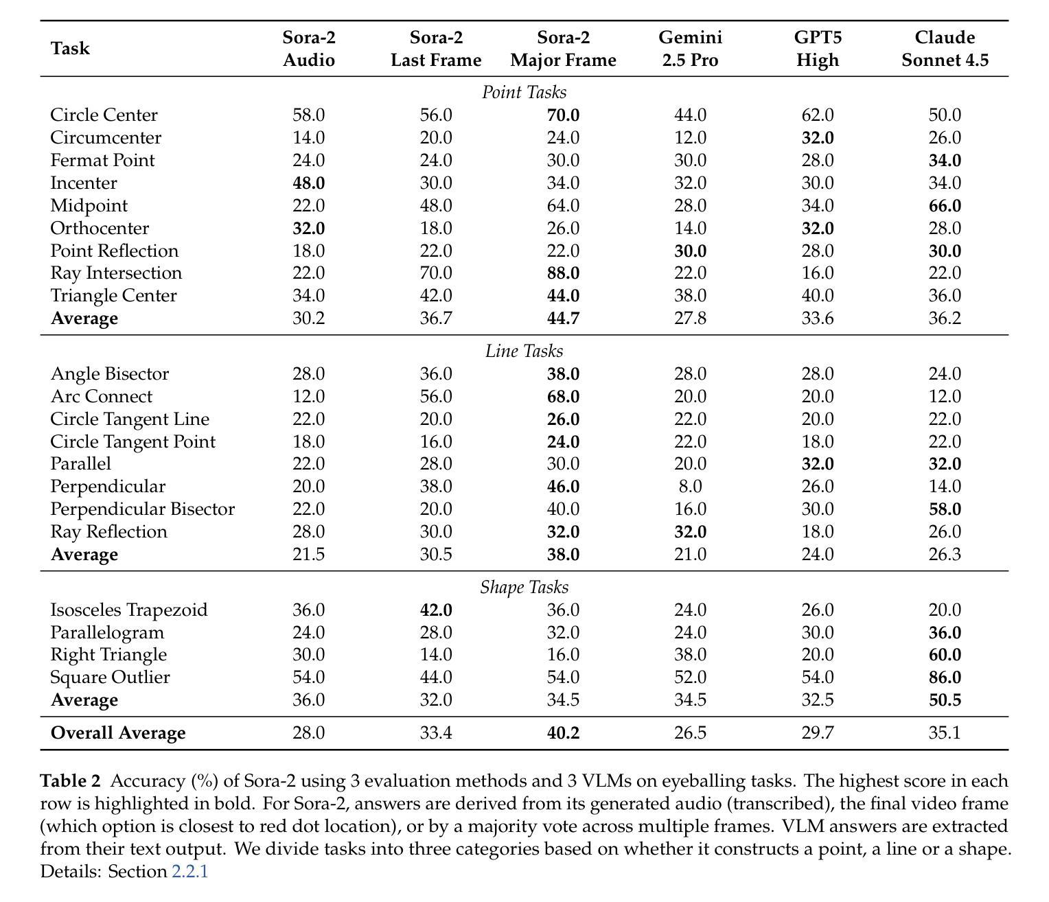 - 评估结果显示Sora-2在多个任务上的表现与最佳VLMs相当或更优,特别是在以视觉为中心的任务上。