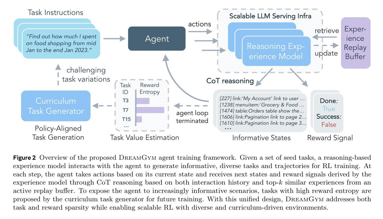 - DreamGym自适应生成新任务以挑战当前代理策略,从而促进知识获取和在线课程学习。
