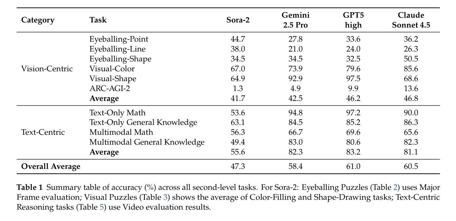 - 在以文本为中心的任务上,Sora-2达到了一定的准确性水平,这显示了其强大的文本处理能力。