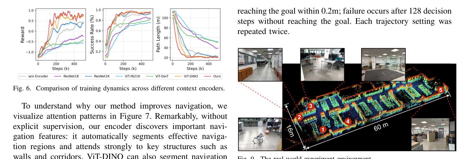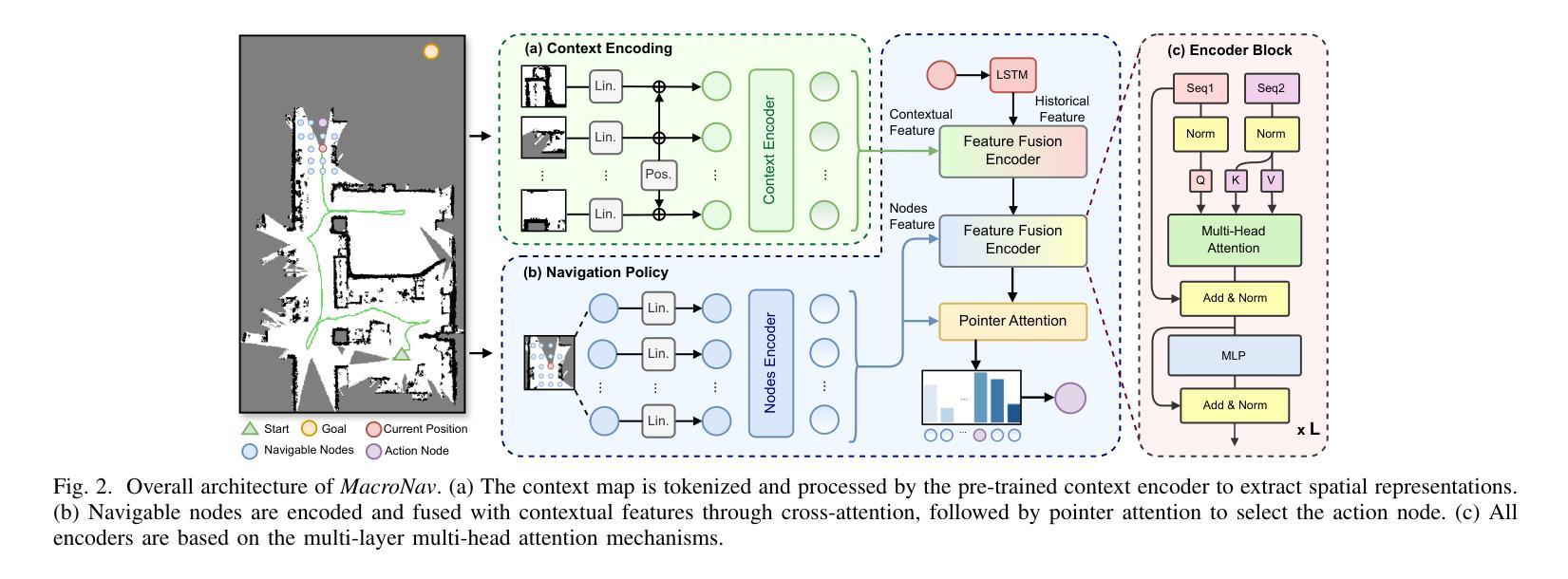 该文提出了一种基于学习的导航框架MacroNav,包含两个关键组件:一个轻量级上下文编码器,通过多任务自我监督学习捕获多尺度、以导航为中心的空间表示;以及一个强化学习策略,无缝集成这些表示与基于图的推理,以进行高效的动作选择。实验表明,上下文编码器能够高效且稳健地理解环境。在现实世界的部署中,MacroNav相对于最新导航方法在成功率(SR)和路径长度加权成功率(SPL)方面取得了显著的提升,同时保持了较低的计算成本。