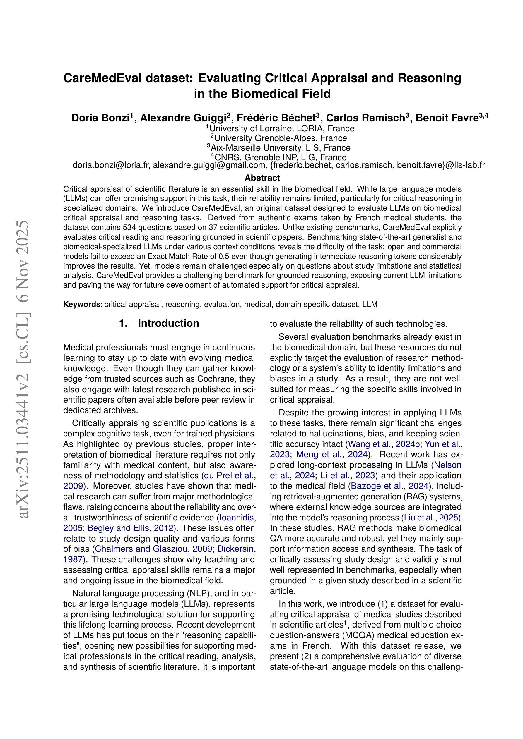 科学文献的批判性评价是生物医学领域的一项基本技能。虽然大型语言模型(LLM)在此任务中提供了有前景的支持,但它们的可靠性仍然有限,特别是在专业领域的批判性推理方面。我们介绍了CareMedEval,这是一个原创数据集,旨在评估LLM在生物医学批判性评价和推理任务上的表现。该数据集来源于法国医学生实际考试中的问题,包含基于37篇科学文章的534个问题。与现有基准测试不同,CareMedEval明确评估基于科学论文的批判性阅读和推理能力。在多种上下文条件下对最新通用LLM和生物医学专业LLM的基准测试表明,该任务的难度很大:开放和商业模型未能超过准确匹配率0.5,尽管生成中间推理标记可以显著改善结果。然而,模型在关于研究局限性和统计分析的问题上仍然面临挑战。CareMedEval为基于情境的推理提供了一个具有挑战性的基准测试,暴露了当前LLM的局限性,并为未来开发自动化支持批判性评价铺平了道路。