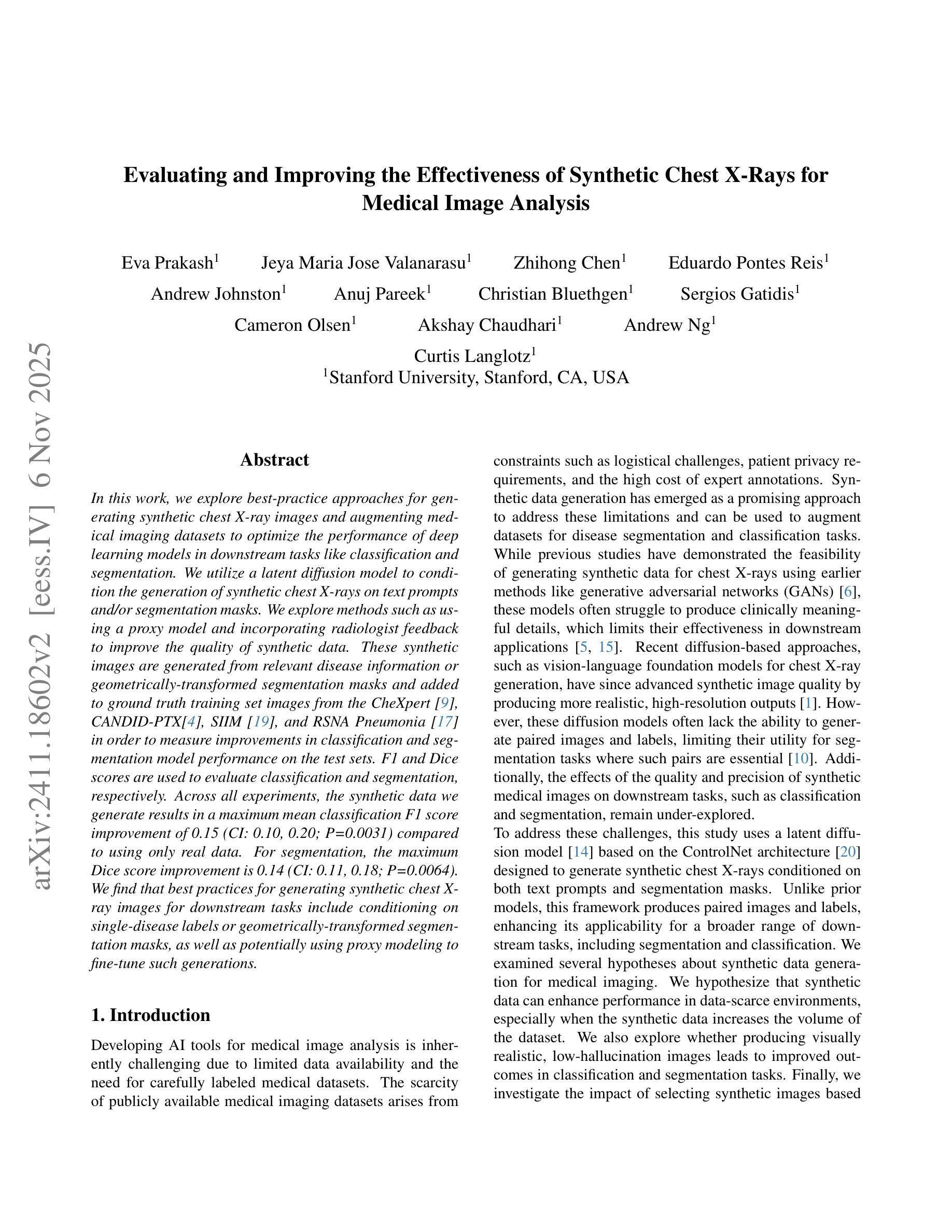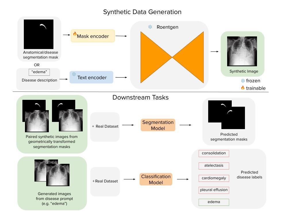 Purpose: To explore best-practice approaches for generating synthetic chest X-ray images and augmenting medical imaging datasets to optimize the performance of deep learning models in downstream tasks like classification and segmentation. Materials and Methods: We utilized a latent diffusion model to condition the generation of synthetic chest X-rays on text prompts and/or segmentation masks. We explored methods like using a proxy model and using radiologist feedback to improve the quality of synthetic data. These synthetic images were then generated from relevant disease information or geometrically transformed segmentation masks and added to ground truth training set images from the CheXpert, CANDID-PTX, SIIM, and RSNA Pneumonia datasets to measure improvements in classification and segmentation model performance on the test sets. F1 and Dice scores were used to evaluate classification and segmentation respectively. One-tailed t-tests with Bonferroni correction assessed the statistical significance of performance improvements with synthetic data. Results: Across all experiments, the synthetic data we generated resulted in a maximum mean classification F1 score improvement of 0.150453 (CI: 0.099108-0.201798; P=0.0031) compared to using only real data. For segmentation, the maximum Dice score improvement was 0.14575 (CI: 0.108267-0.183233; P=0.0064). Conclusion: Best practices for generating synthetic chest X-ray images for downstream tasks include conditioning on single-disease labels or geometrically transformed segmentation masks, as well as potentially using proxy modeling for fine-tuning such generations.