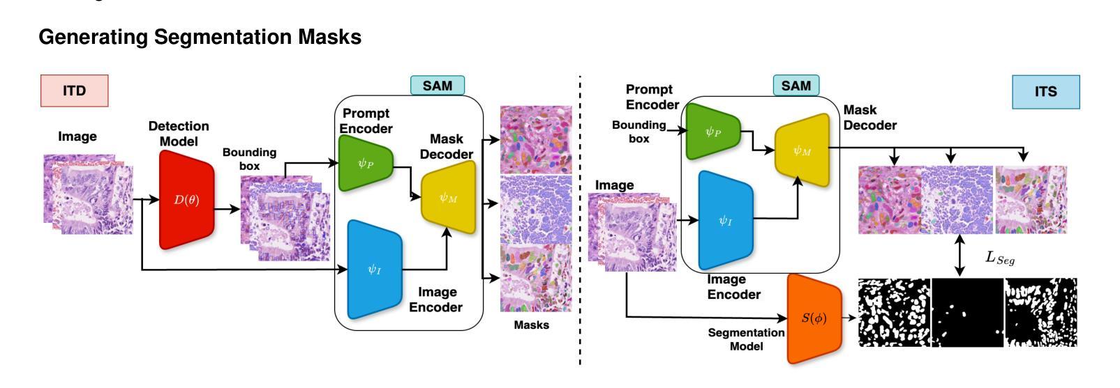 病理图像中的细胞分割对于多种疾病的诊断和治疗至关重要。数据标注是一项乏味且需要医学专业知识的工作,使得采用监督学习变得困难。因此,我们研究了一种弱监督环境,其中仅提供边界框监督,并展示了在不进行任何微调的情况下直接使用预训练模型使用Segment Anything(SAM)。我们提出BoxCell,这是一种细胞分割框架,利用SAM将边界框解释为提示的能力,在训练和测试时都是如此。在训练过程中,提供给SAM的金边界框会产生(伪)掩膜,用于训练独立的分段器。在测试时,BoxCell生成两个分割掩膜:(1)由该独立分段器生成,(2)训练好的对象检测器输出边界框,这些边界框作为提示给SAM以产生另一个掩膜。通过识别互补的优势,我们使用具有强度和空间约束的新型整数编程公式来协调这两个分割掩膜。我们在三个公开的细胞分割数据集CoNSep、MoNuSeg和TNBC上进行实验,发现BoxCell显著优于现有的盒式监督图像分割模型,Dice得分提高了6-10个点。