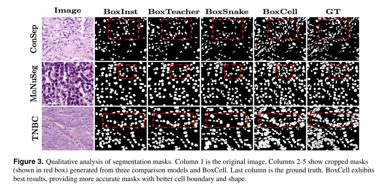 - BoxCell框架在训练和测试阶段都利用SAM的解读能力,通过边界框生成伪掩膜训练独立分割器。