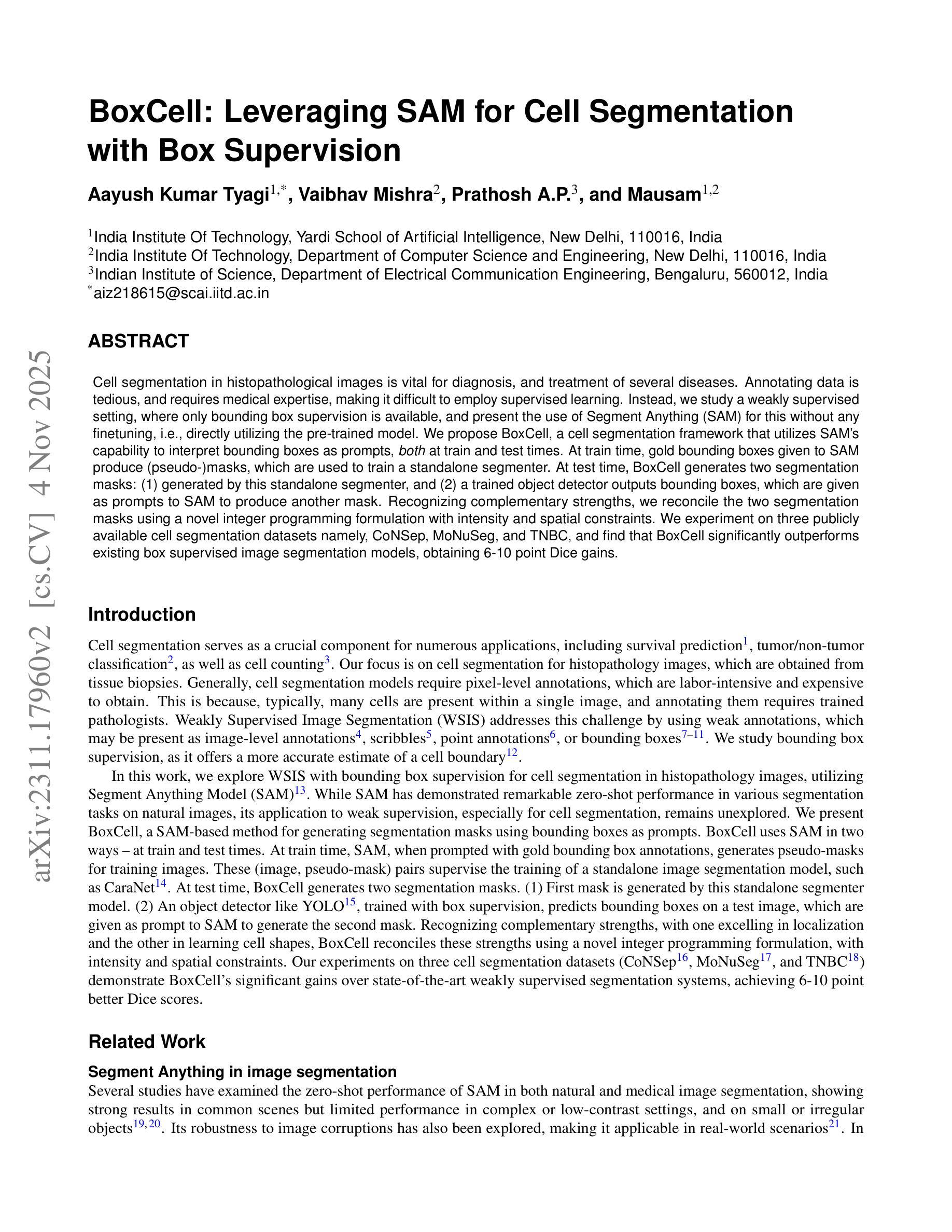 Cell segmentation in histopathological images is vital for diagnosis, and treatment of several diseases. Annotating data is tedious, and requires medical expertise, making it difficult to employ supervised learning. Instead, we study a weakly supervised setting, where only bounding box supervision is available, and present the use of Segment Anything (SAM) for this without any finetuning, i.e., directly utilizing the pre-trained model. We propose BoxCell, a cell segmentation framework that utilizes SAM’s capability to interpret bounding boxes as prompts, \emph{both} at train and test times. At train time, gold bounding boxes given to SAM produce (pseudo-)masks, which are used to train a standalone segmenter. At test time, BoxCell generates two segmentation masks: (1) generated by this standalone segmenter, and (2) a trained object detector outputs bounding boxes, which are given as prompts to SAM to produce another mask. Recognizing complementary strengths, we reconcile the two segmentation masks using a novel integer programming formulation with intensity and spatial constraints. We experiment on three publicly available cell segmentation datasets namely, CoNSep, MoNuSeg, and TNBC, and find that BoxCell significantly outperforms existing box supervised image segmentation models, obtaining 6-10 point Dice gains.