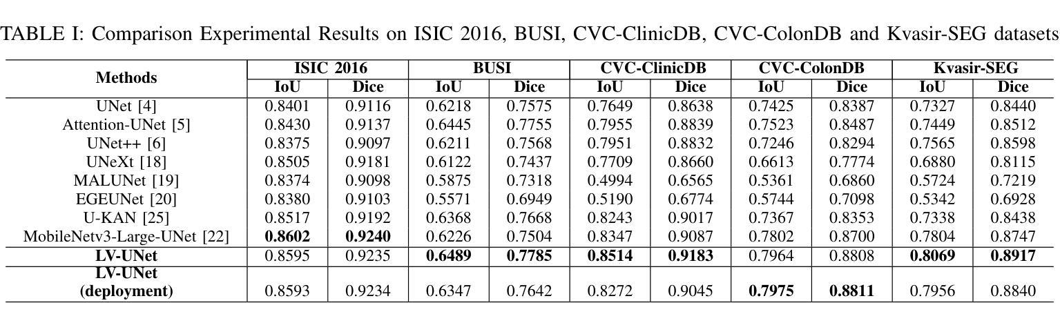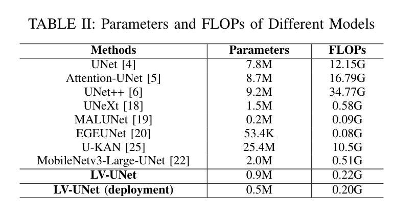 - 实验结果证明LV-UNet在计算负载和性能之间取得良好平衡。
