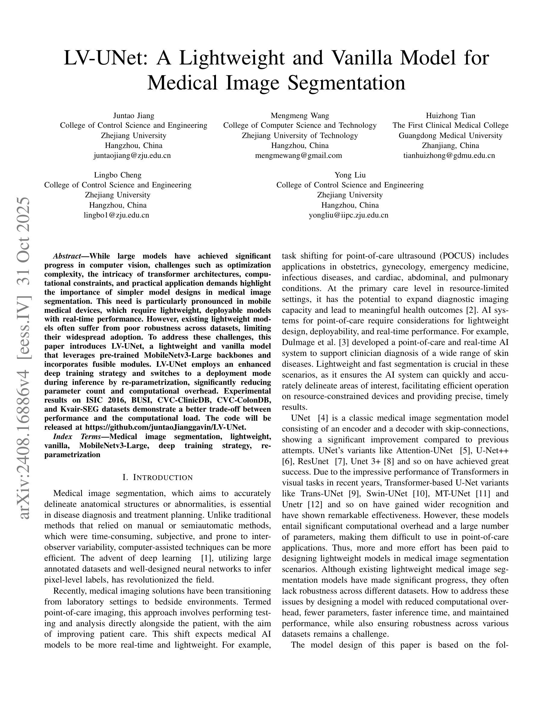 在计算机视觉领域,大型模型已经取得了显著进展,但优化复杂性、转换器架构的复杂性、计算约束和实际应用需求等挑战突显了在医学图像分割中更简单模型设计的重要性。这一需求在移动医疗设备中尤为突出,这些设备需要轻便、可部署的具有实时性能要求的模型。然而,现有的轻量化模型通常在跨数据集方面存在鲁棒性不足的问题,限制了其广泛应用。为了应对这些挑战,本文引入了LV-UNet,这是一个轻量级的普通模型,它利用预训练的MobileNetv3-Large骨干网并融入了可融合模块。LV-UNet采用了一种增强的深度训练策略,并通过重新参数化在推理时切换到部署模式,显著减少了参数计数和计算开销。在ISIC 2016、BUSI、CVC-ClinicDB、CVC-ColonDB和Kvair-SEG数据集上的实验结果表明,它在性能和计算负载之间达到了更好的权衡。代码将在https://github.com/juntaoJianggavin/LV-UNet发布。