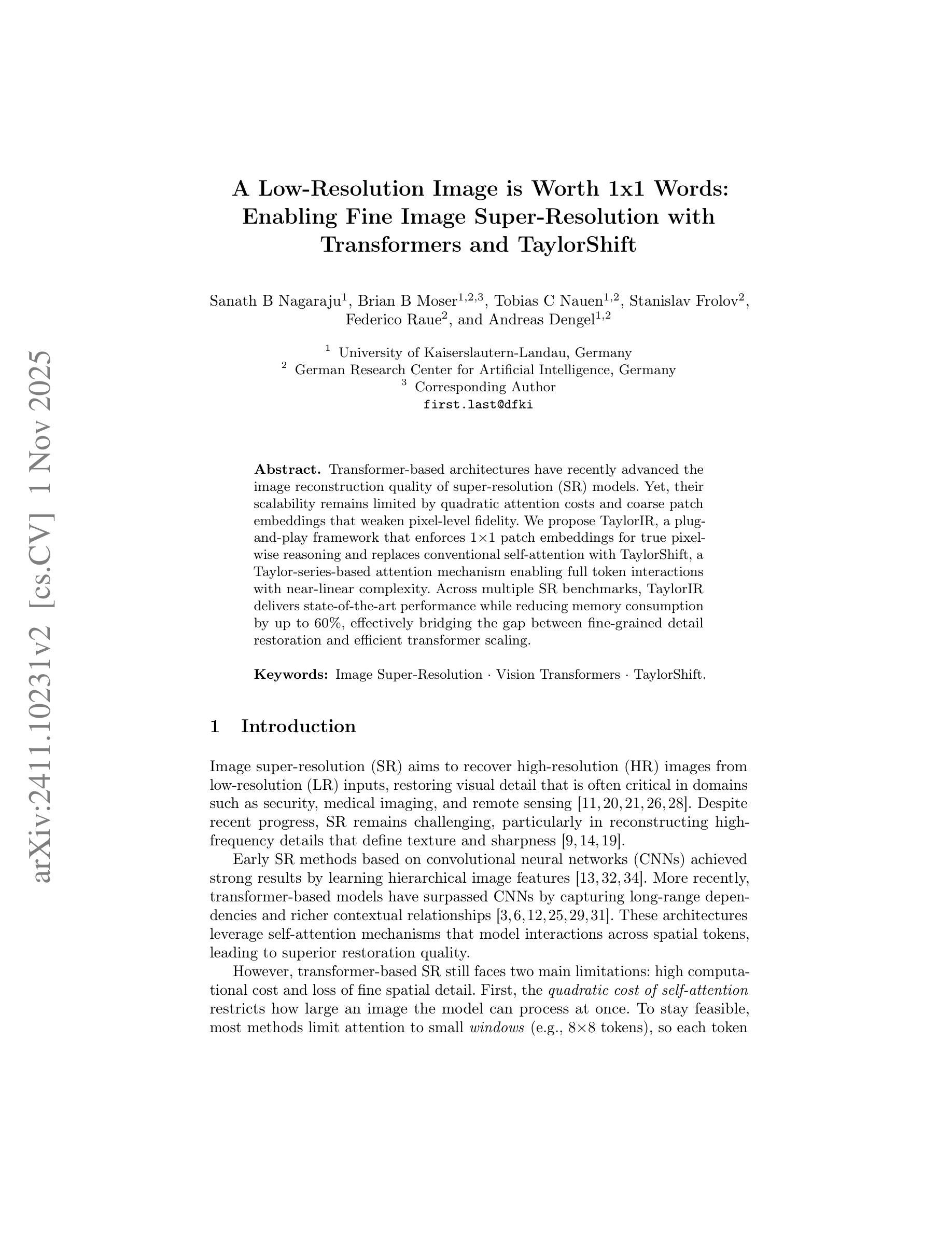 基于Transformer的架构已提升超分辨率(SR)模型的图像重建质量,但其可扩展性受限于二次方的注意力成本及粗粒度的补丁嵌入,这会削弱像素级别的保真度。本文提出TaylorIR,一个即插即用的框架,采用1x1像素级别的补丁嵌入和基于泰勒序列的注意力机制替换常规的自注意力,实现全token交互并接近线性复杂度。在多个SR基准测试中,TaylorIR达到了最新技术水平,同时降低了高达60%的内存消耗,有效桥接了精细粒度细节恢复和高效Transformer扩展之间的鸿沟。