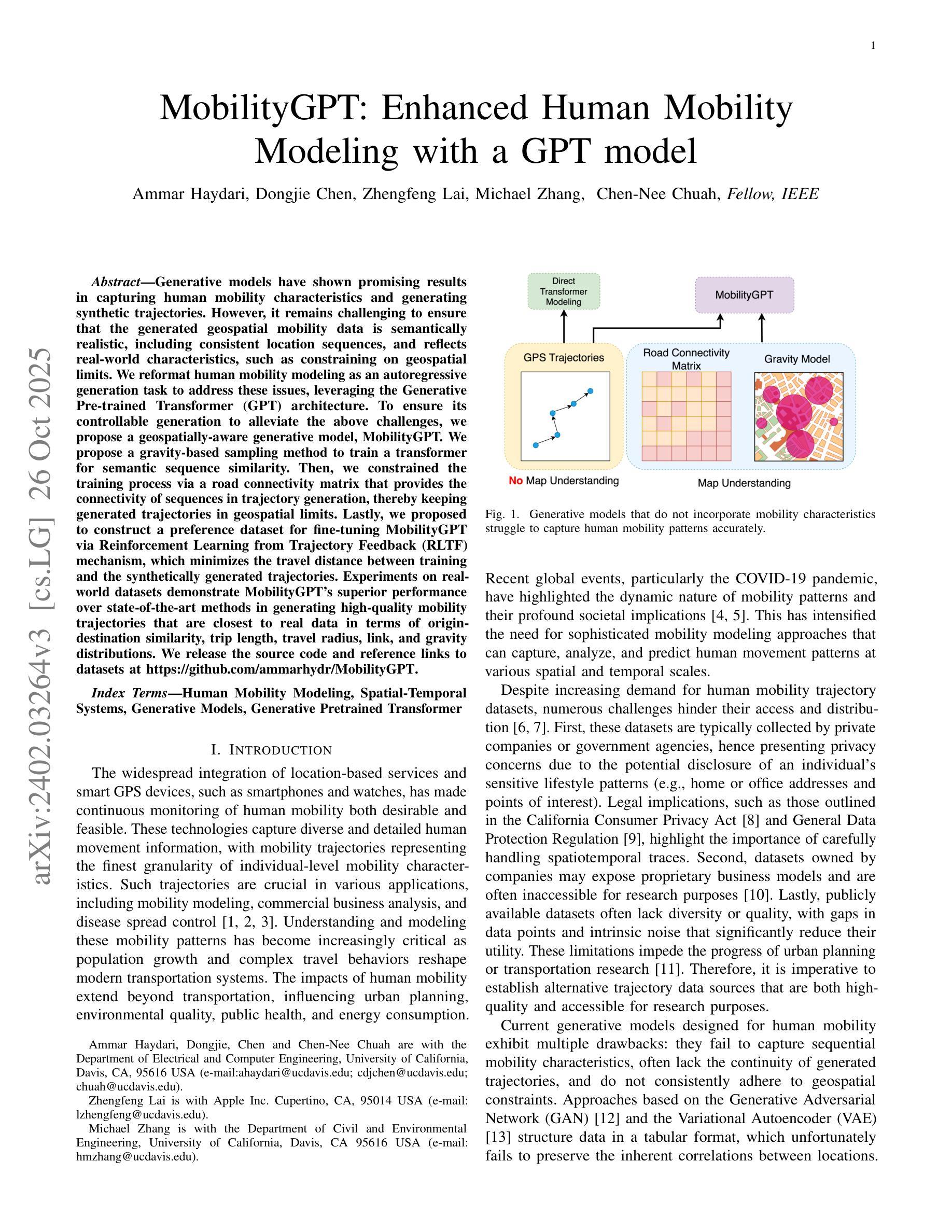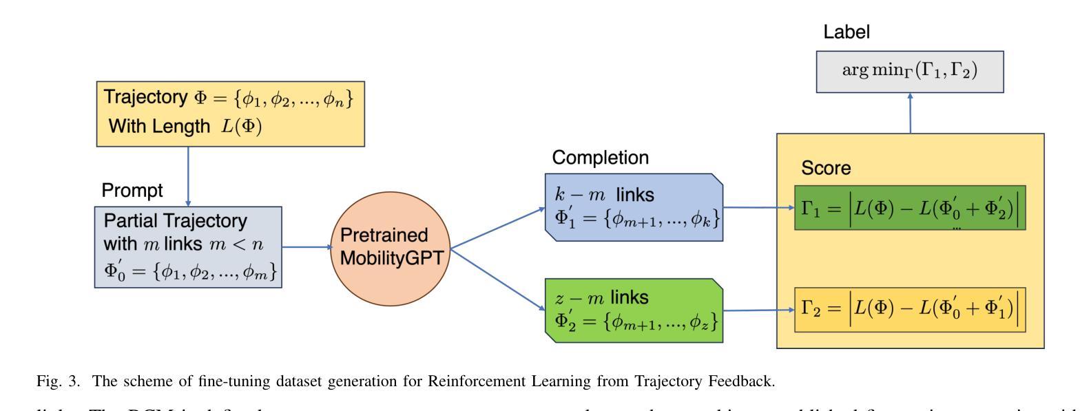 生成模型在捕捉人类移动特性和生成合成轨迹方面已显示出有前景的结果。然而,确保生成的地理空间移动数据在语义上是现实的,包括位置序列的一致性,并反映现实世界的特点,如地理空间限制,仍然是一个挑战。我们将人类移动建模重塑为自回归生成任务,以解决这些问题,并利用生成预训练转换器(GPT)架构。为了确保可控生成,以减轻上述挑战,我们提出了一种地理空间感知的生成模型,即MobilityGPT。我们提出了一种基于引力的采样方法来训练转换器,以实现语义序列相似性。然后,我们通过道路连通性矩阵约束训练过程,该矩阵提供了轨迹生成中序列的连通性,从而保持生成的轨迹在地理空间限制内。最后,我们提出通过基于轨迹反馈的强化学习(RLTF)机制构建偏好数据集,对MobilityGPT进行微调,最小化训练和合成轨迹之间的旅行距离。在真实世界数据集上的实验表明,MobilityGPT在生成高质量移动轨迹方面的性能优于最先进的方法,在起点和终点相似性、行程长度、旅行半径、链接和引力分布方面最接近真实数据。我们在https://github.com/ammarhydr/MobilityGPT上发布了源代码和参考数据集链接。
