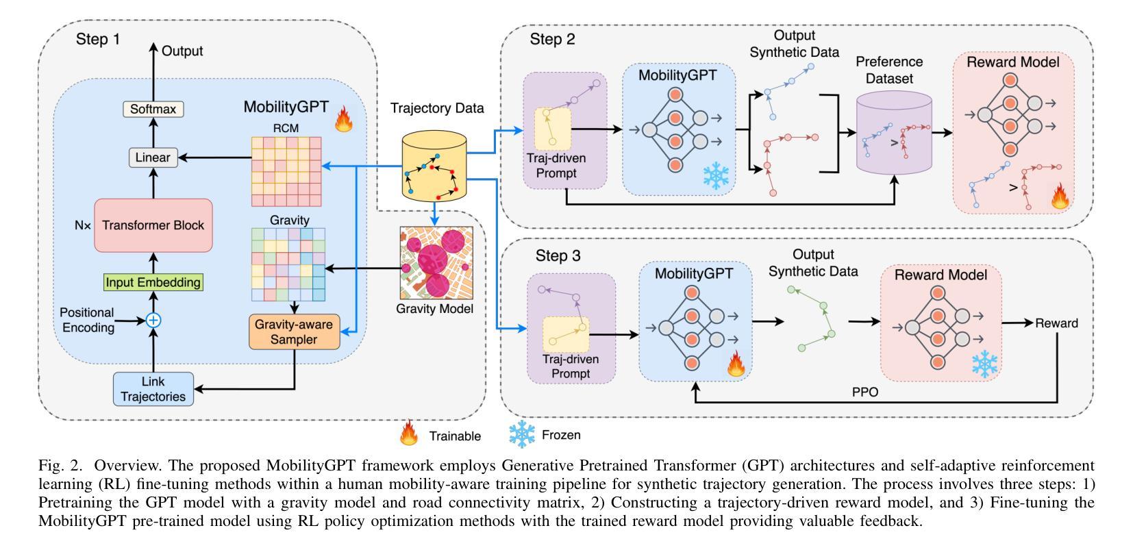 基于生成式预训练转换器(GPT)架构,研究者提出了一种地理空间感知的生成模型MobilityGPT,用于解决人类移动性建模的问题。该模型通过自回归生成任务的形式,能够捕捉人类移动性特征并生成合成轨迹。为解决生成的地理空间数据语义真实性问题,研究者提出了基于重力的采样方法进行训练,并通过道路连通性矩阵约束训练过程,以保证生成轨迹的地理空间限制。此外,通过强化学习从轨迹反馈(RLTF)机制构建偏好数据集进行微调,使MobilityGPT能够生成最接近真实数据的优质移动轨迹。