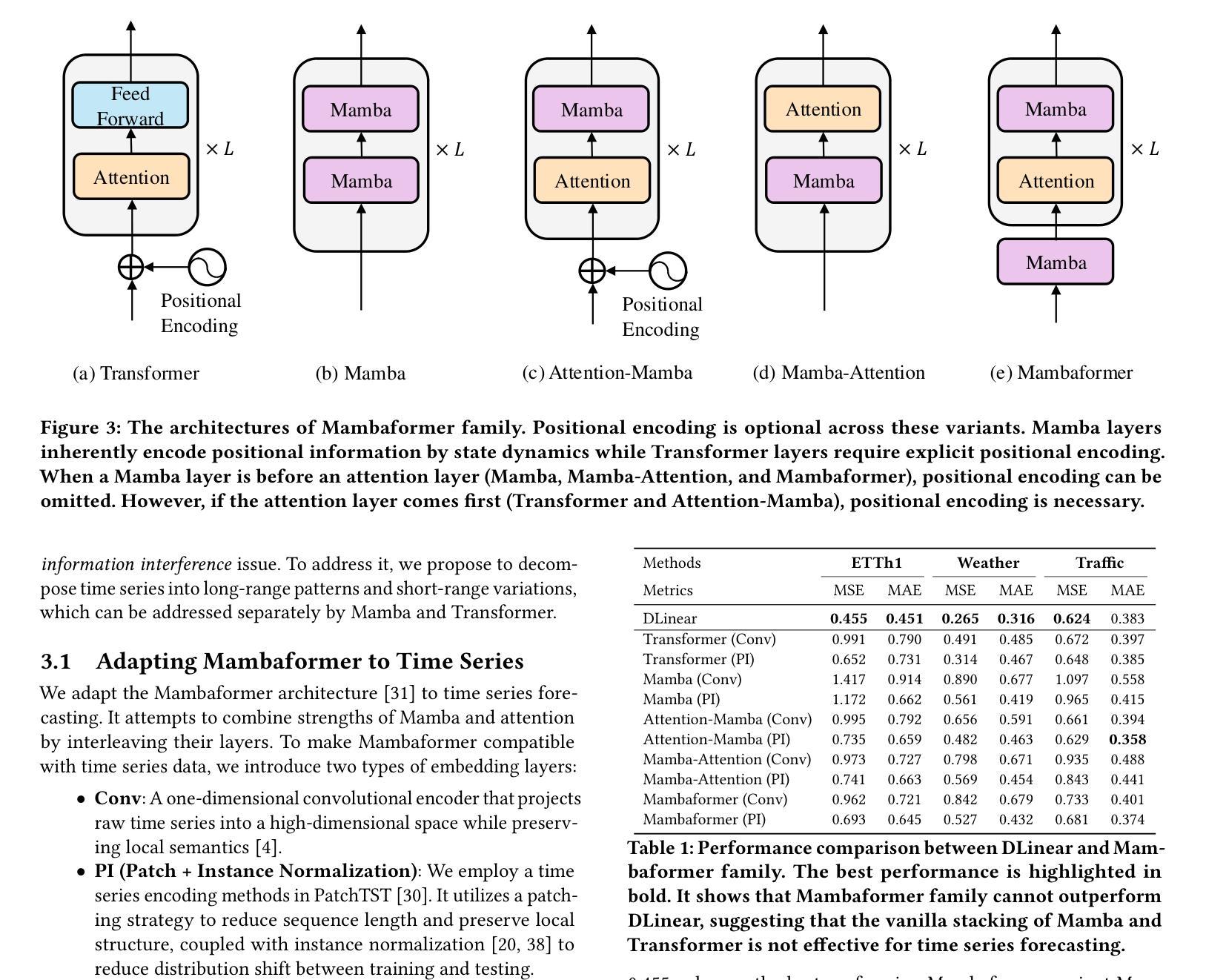 - Mambaformer架构结合了Mamba和Transformer,但简单堆叠这两者在时间序列预测中效果不佳,存在信息干扰。