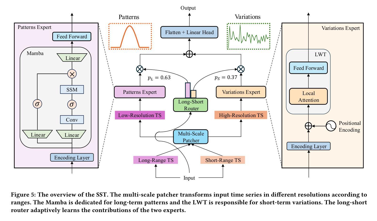 - SST是一个多尺度混合模型,包含针对长期和短期变化的专家模块,并采用多尺度补丁机制优化性能。