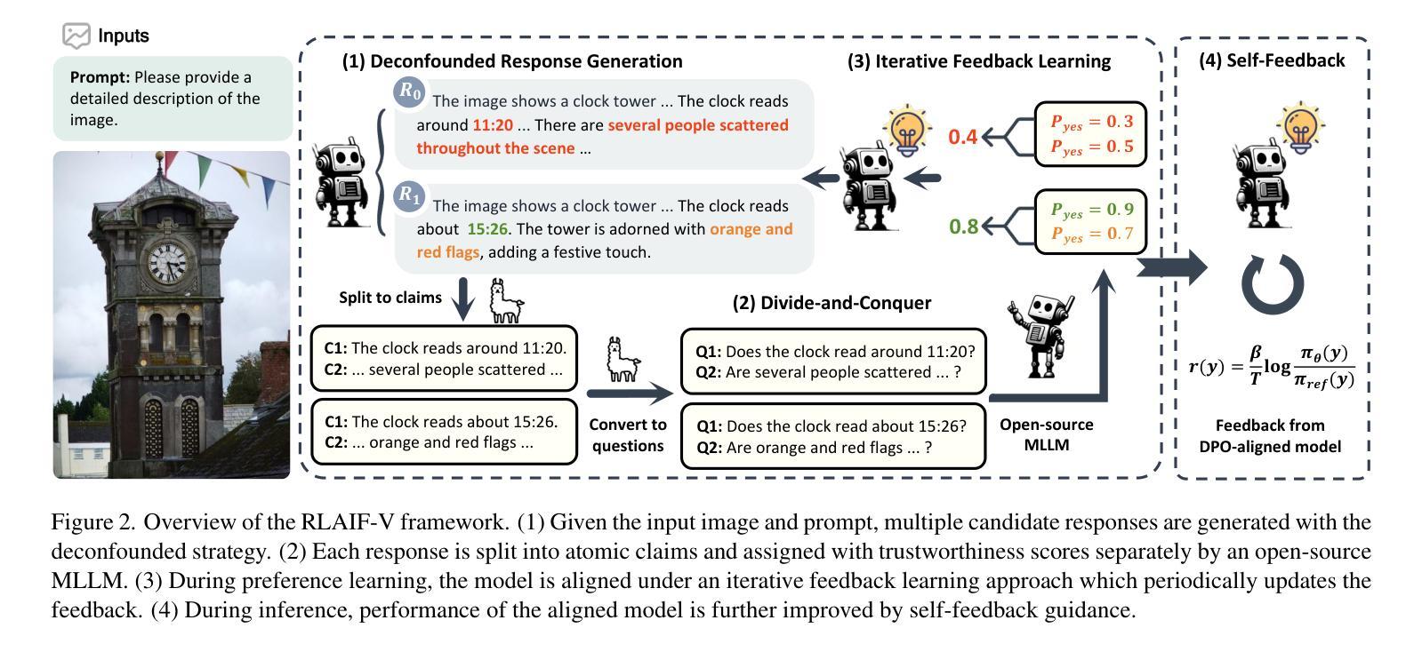 - 在推理时间,RLAIF-V通过自反馈指导增强了模型的信任度。