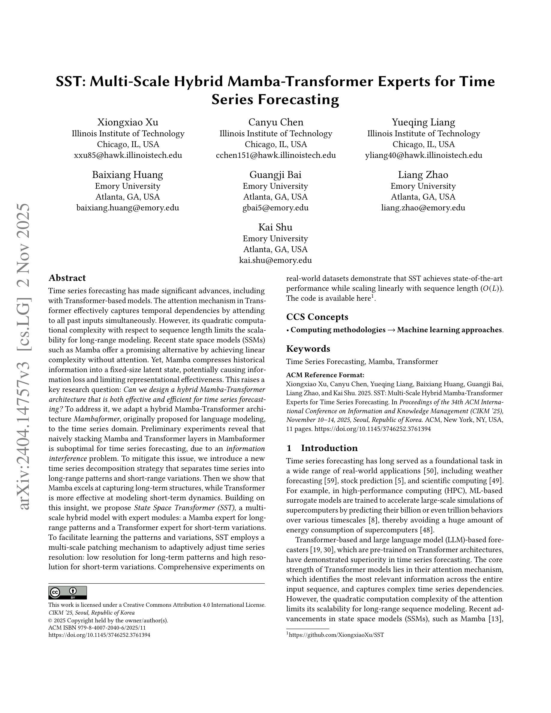 时间序列预测已经取得了重大进展,包括基于Transformer的模型。Transformer中的注意力机制通过同时关注所有过去的输入有效地捕捉了时间依赖性。然而,其关于序列长度的二次复杂性限制了长程建模的可扩展性。最近的状态空间模型(SSM),如Mamba,通过实现无需注意力的线性复杂性提供了一种有前途的替代方案。然而,Mamba将历史信息压缩为固定大小的潜在状态,可能导致信息丢失并限制其表示的有效性。这引发了一个关键的研究问题:我们能否设计出一种混合的Mamba-Transformer架构,既能有效地进行时间序列预测,又能提高效率?为了解决这一问题,我们将原本为语言模型设计的混合Mamba-Transformer架构Mambaformer,适应到时间序列领域。初步实验表明,在Mambaformer中简单地堆叠Mamba和Transformer层对于时间序列预测来说并不是最优的,因为存在信息干扰问题。为了缓解这个问题,我们引入了一种新的时间序列分解策略,将时间序列分解为长期模式和短期变化。然后我们发现Mamba在捕捉长期结构方面表现出色,而Transformer在模拟短期动态方面更为有效。基于这一见解,我们提出了状态空间Transformer(SST),这是一个多尺度混合模型,包含专业模块:用于长期模式的Mamba专家和用于短期变化的Transformer专家。SST还采用了一种多尺度补丁机制来自适应地调整时间序列的分辨率:长期模式使用低分辨率,短期变化使用高分辨率。实验表明,SST具有线性可扩展性,并获得了最先进的性能。代码地址为:https://github.com/XiongxiaoXu/SST。