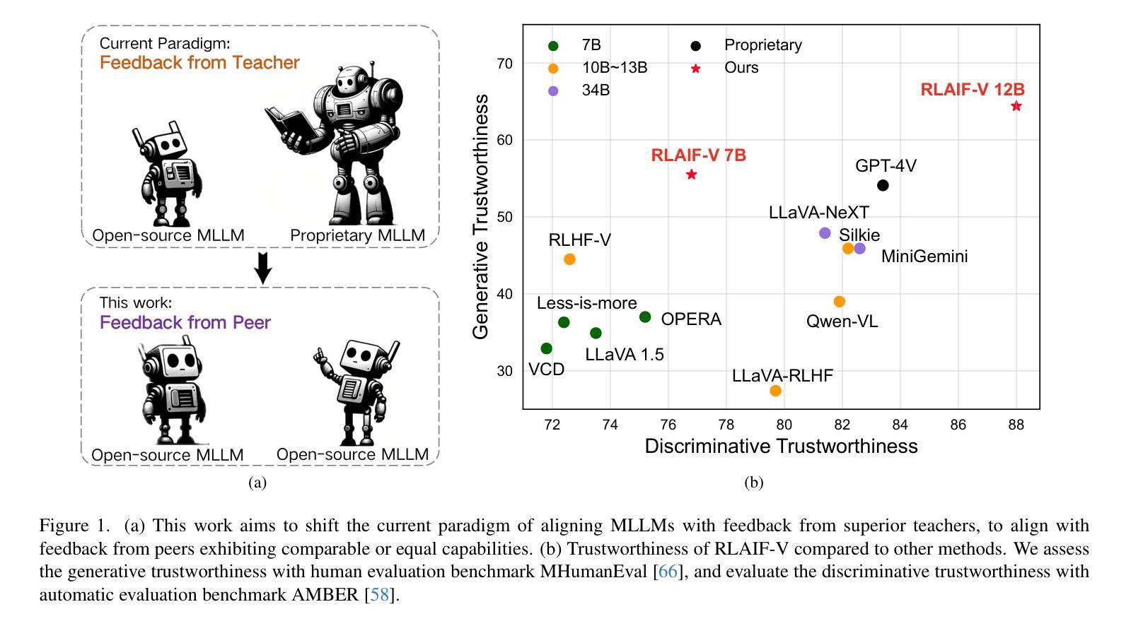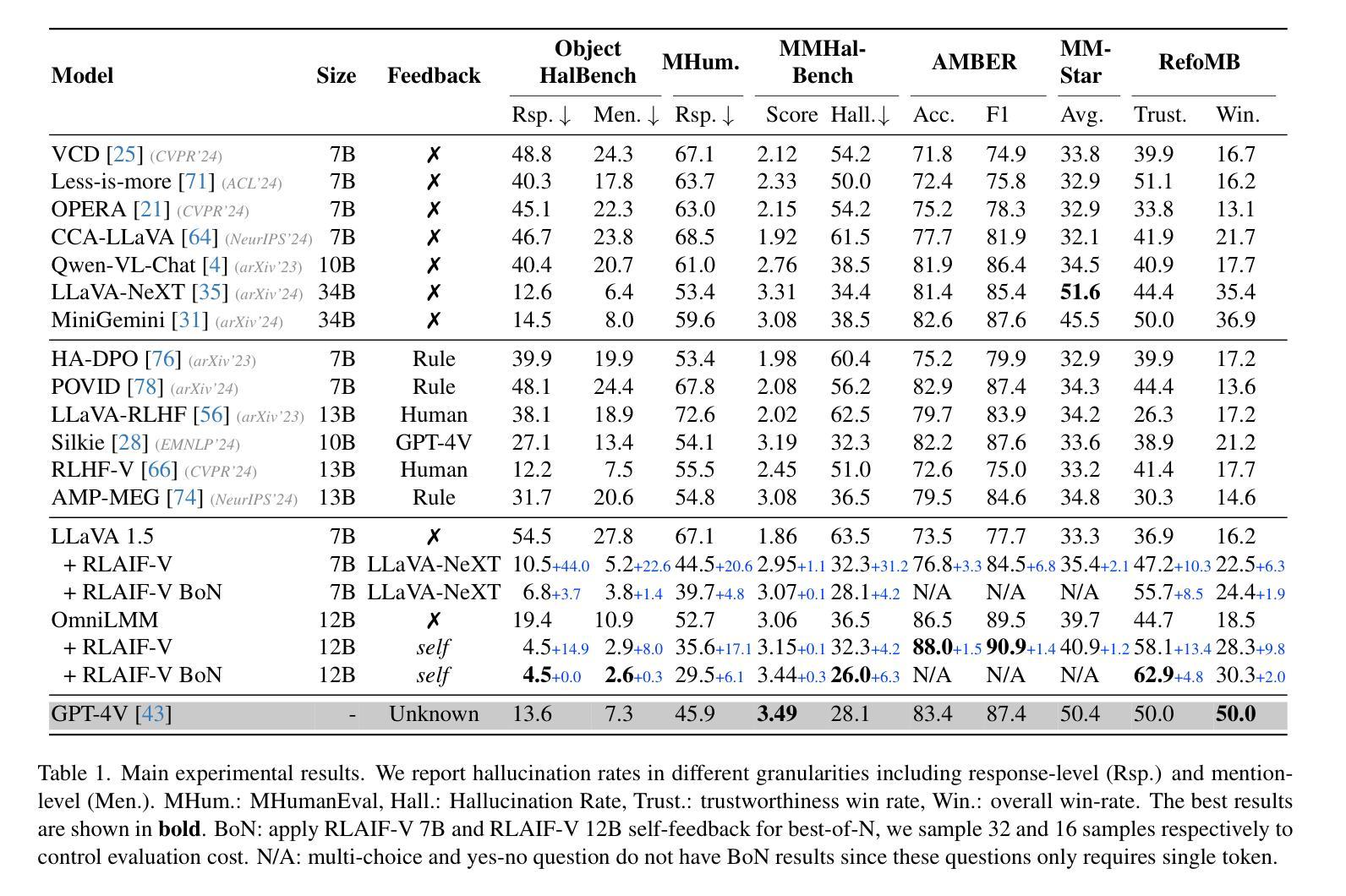 - RLAIF-V 12B版本展示了开源LLM的自我对齐潜力,即模型能从自身反馈中学习。