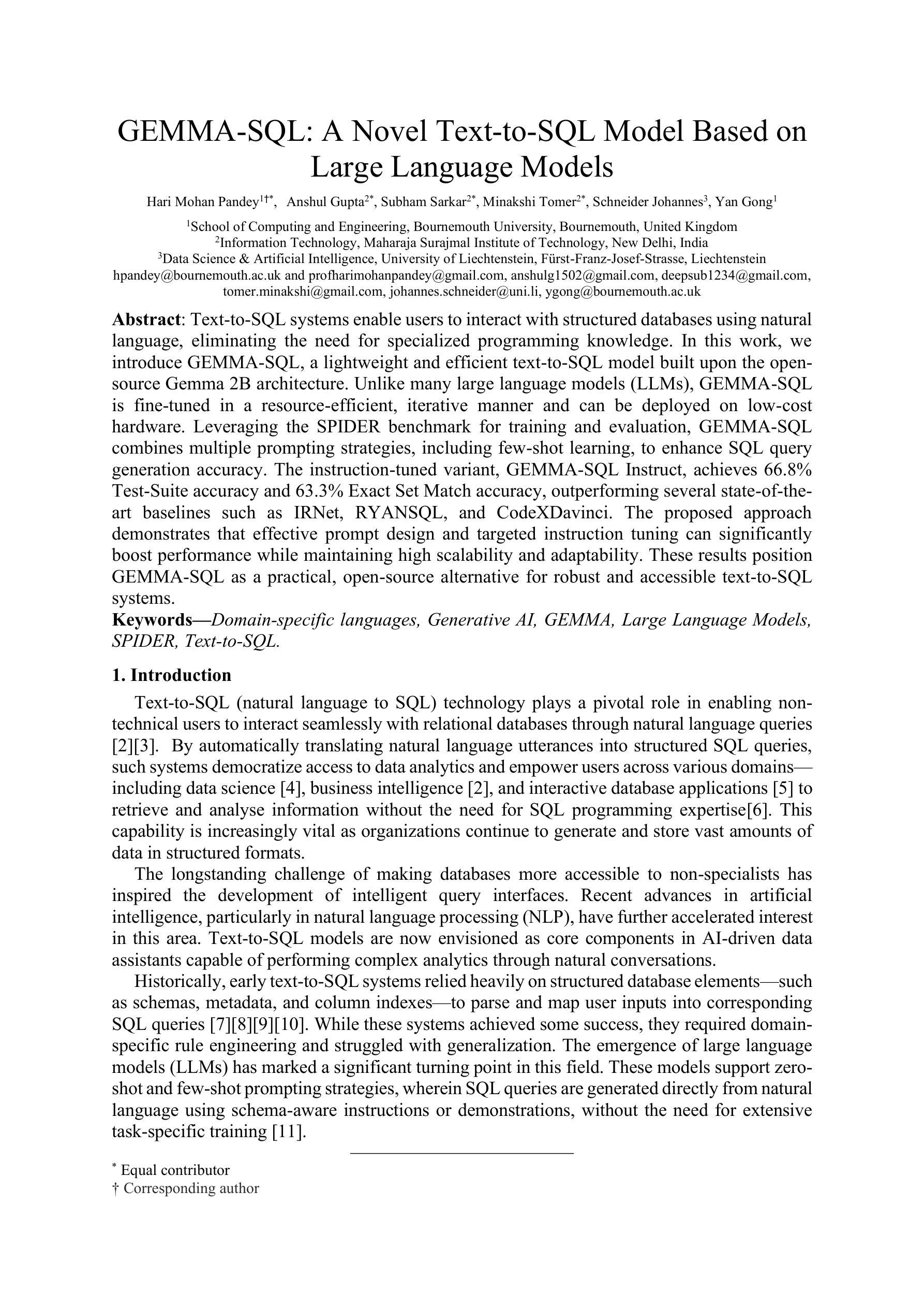 文本转SQL系统允许用户通过自然语言与结构化数据库进行交互,无需特定编程知识。本研究引入了一个基于开源Gemma 2B架构的轻量级、高效的文本转SQL模型——GEMMA-SQL。与其他大型语言模型不同,GEMMA-SQL以资源高效的方式进行微调,并可在低成本硬件上部署。通过SPIDER基准进行训练和评估,GEMMA-SQL结合了多种提示策略,包括少样本学习,以提高SQL查询生成准确性。指令调整型变体GEMMA-SQL Instruct达到了66.8%的测试套件准确率和63.3%的确切集匹配准确率,优于多个先进基线模型,如IRNet、RYANSQL和CodeXDavinci。该研究证明了有效的提示设计和有针对性的指令调整可以在保持高可扩展性和适应性的同时显著提高性能。这些成果确立了GEMMA-SQL作为一个实用、开源的文本转SQL系统的稳健和可访问的替代方案。