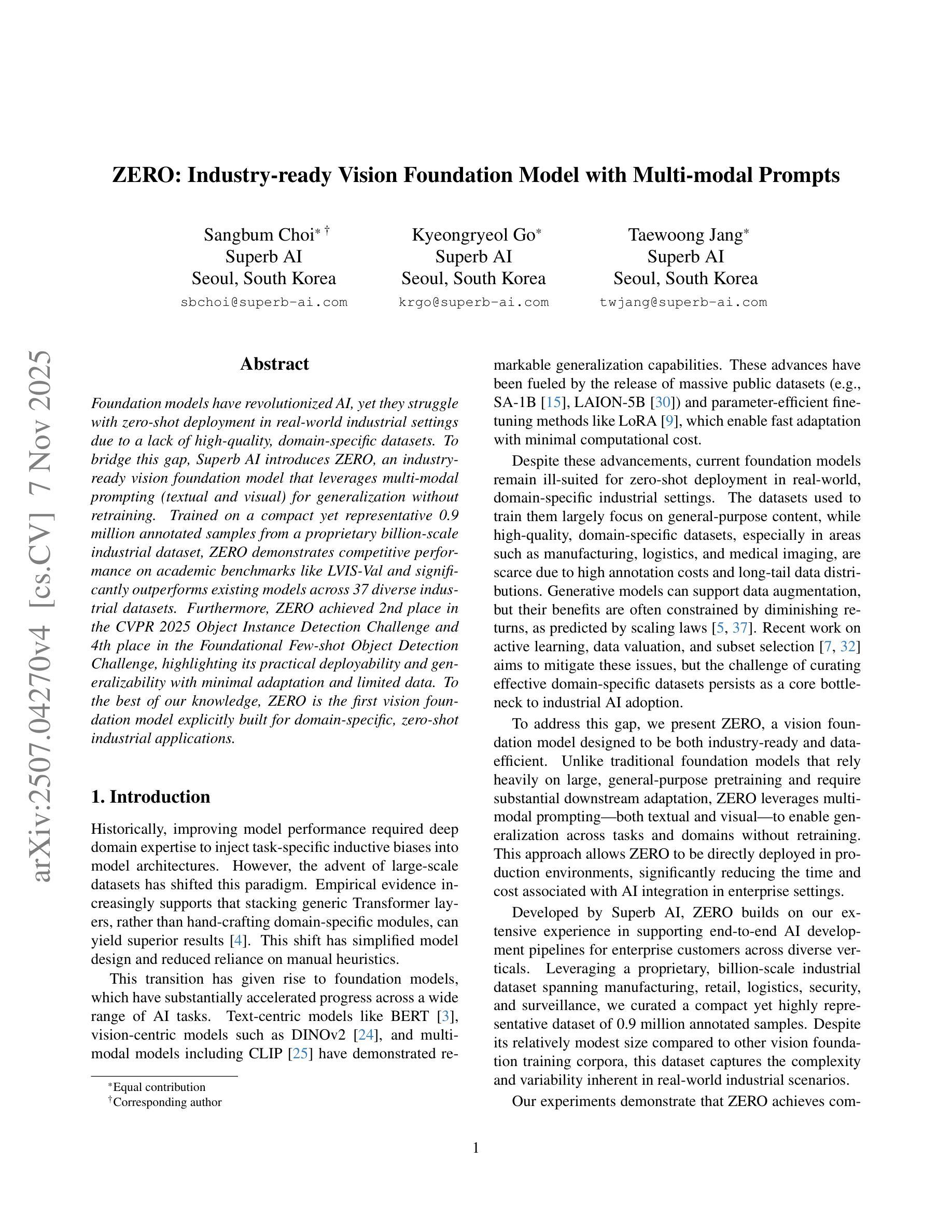 Foundation models have revolutionized AI, yet they struggle with zero-shot deployment in real-world industrial settings due to a lack of high-quality, domain-specific datasets. To bridge this gap, Superb AI introduces ZERO, an industry-ready vision foundation model that leverages multi-modal prompting (textual and visual) for generalization without retraining. Trained on a compact yet representative 0.9 million annotated samples from a proprietary billion-scale industrial dataset, ZERO demonstrates competitive performance on academic benchmarks like LVIS-Val and significantly outperforms existing models across 37 diverse industrial datasets. Furthermore, ZERO achieved 2nd place in the CVPR 2025 Object Instance Detection Challenge and 4th place in the Foundational Few-shot Object Detection Challenge, highlighting its practical deployability and generalizability with minimal adaptation and limited data. To the best of our knowledge, ZERO is the first vision foundation model explicitly built for domain-specific, zero-shot industrial applications.