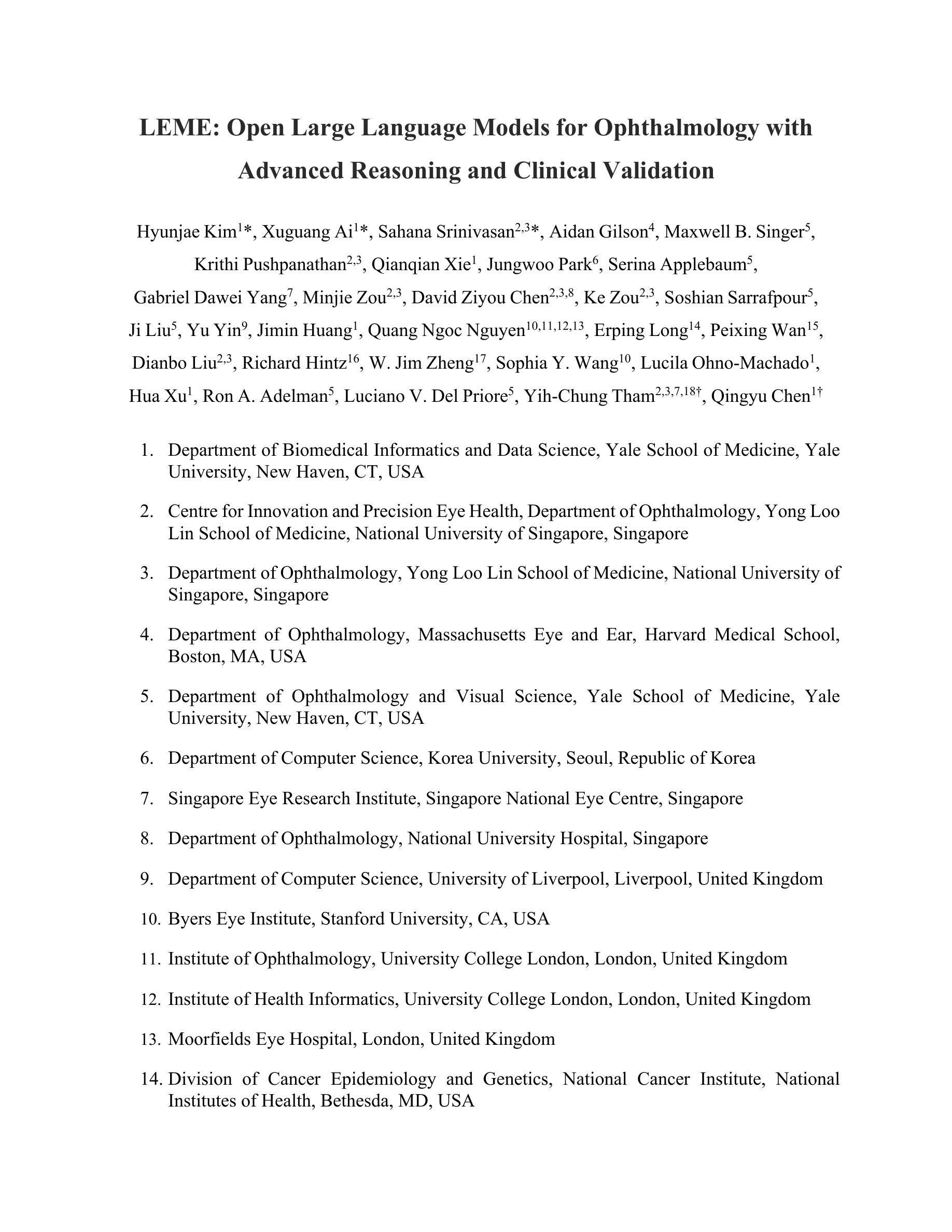 Authors:Hyunjae Kim, Xuguang Ai, Sahana Srinivasan, Aidan Gilson, Maxwell B. Singer, Krithi Pushpanathan, Qianqian Xie, Jungwoo Park, Serina Applebaum, Gabriel Dawei Yang, Minjie Zou, David Ziyou Chen, Ke Zou, Soshian Sarrafpour, Ji Liu, Yu Yin, Jimin Huang, Quang Ngoc Nguyen, Erping Long, Peixing Wan, Dianbo Liu, Richard Hintz, W. Jim Zheng, Sophia Y. Wang, Lucila Ohno-Machado, Hua Xu, Ron A. Adelman, Luciano V. Del Priore, Yih-Chung Tham, Qingyu Chen