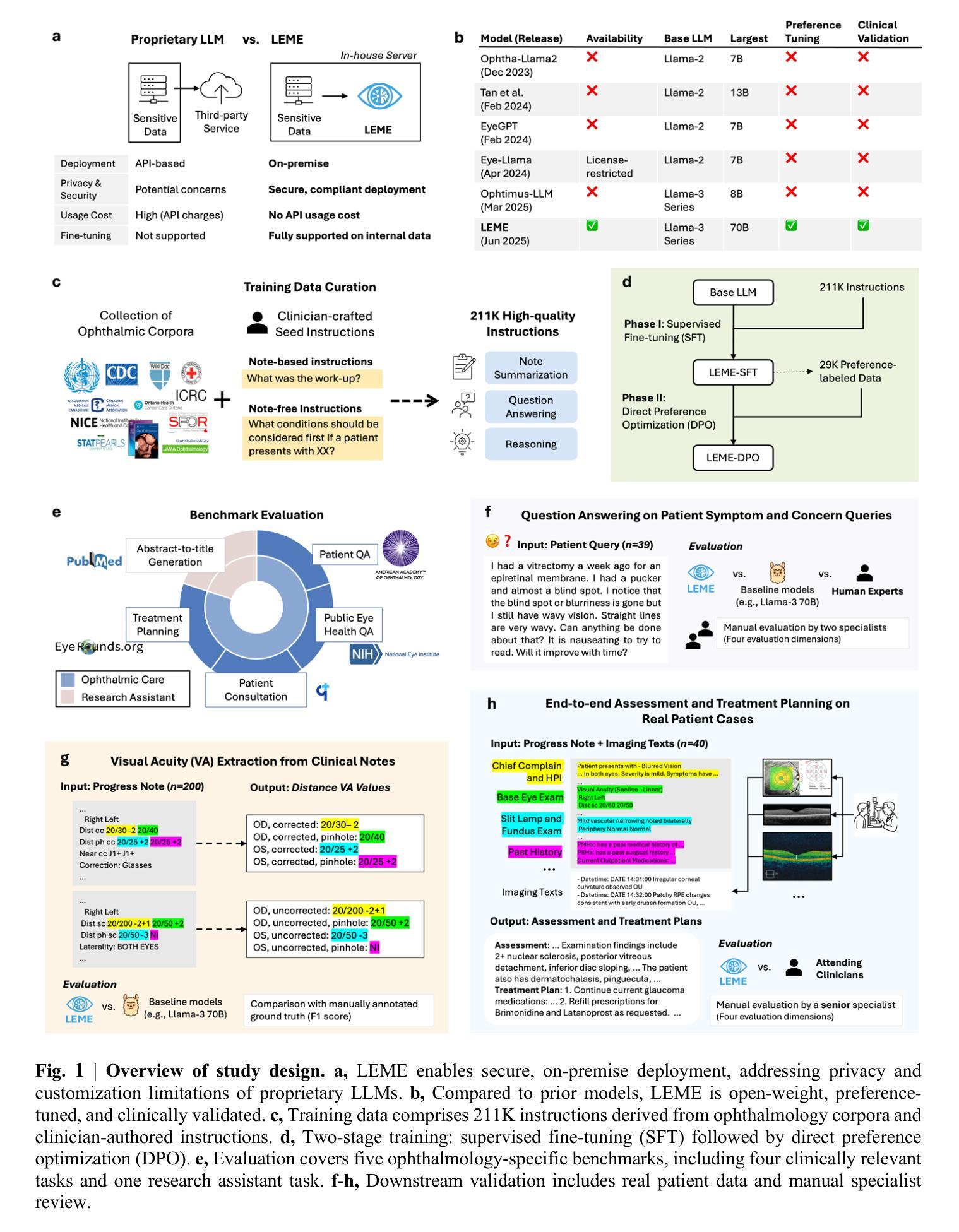 眼疾日益普遍,给公共卫生带来了越来越大的负担。大型语言模型(LLM)为减少文档工作量并支持临床决策制定提供了前景。然而,针对眼科领域定制的大型语言模型并不多,而且大多数评估主要集中在基于知识的问答上,缺乏临床相关的基准测试或现实世界的验证。在这里,我们推出了LEME,这是一套通过两个阶段开发出的开源大型语言模型:首先是基于来自临床指南、教科书和病例报告的20万个样本进行指令微调,以增强推理和完成任务的能力;其次是使用大约3万偏好标签进行强化学习,以提高准确性和信息量。LEME在五个精心挑选的零样本基准测试上进行了评估,涵盖了患者问答、咨询和治疗计划等任务。它超越了所有七个基准(所有p < 0.004),比GPT-4o高出3.32%(绝对ROUGE-L增益)。它进一步在三个下游任务中使用匿名患者数据进行了评估,并得到了临床医生的审查。在患者问答方面,LEME在四项标准中有三项获得了主治医师的最高评分,事实性得分为4.67,特异性得分为4.77,完整性得分为4.79,安全性得分为4.88(1-5分制)。其完整性得分超过了专家答案的得分(4.79 vs 4.56;p = 0.015)。在视力提取方面,LEME取得了最高的F1分数,比LLaMA-3高出14.1%,比Eye-LLaMA高出59.0%。在针对糖尿病视网膜病变、AMD和青光眼评估和治疗的试点评估中,LEME在事实性、特异性、完整性和安全性方面的得分分别为4.36、4.55、4.42和4.36,接近主治医师级别的表现。所有模型、数据和代码都将发布,以支持进一步的开发和临床翻译应用,为提高效率和患者护理奠定基础。