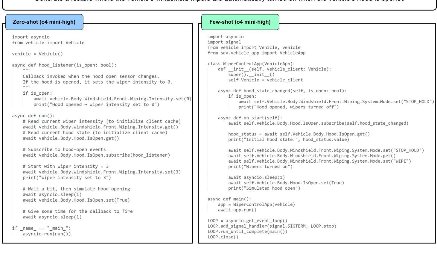 软件定义车辆(SDV)的出现标志着汽车行业的一个范式转变,软件在定义车辆功能方面发挥着关键作用,促进了现代车辆的快速创新。开发SDV特定应用程序需要高级工具来简化代码生成并提高工作效率。本研究探讨了通过使用提示来利用大型语言模型(LLM)在SDV代码生成中的潜力。通过使用系统提示和高效的提示结构,可以在无需进行训练会话或访问基本设计的情况下,运用先进的提示工程技术来引导LLM的响应。本研究进行了广泛的实验,应用了各种提示技术,包括裸模型,并使用专门创建的基准测试来评估LLM在生成SDV代码方面的表现。结果表明,采用少提示策略的模型在根据定量指标调整LLM答案以匹配预期结果方面表现最佳。