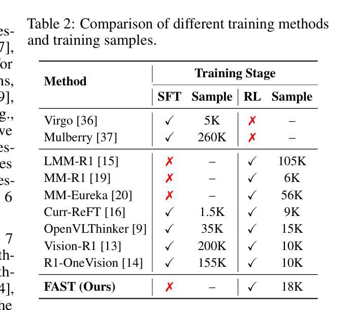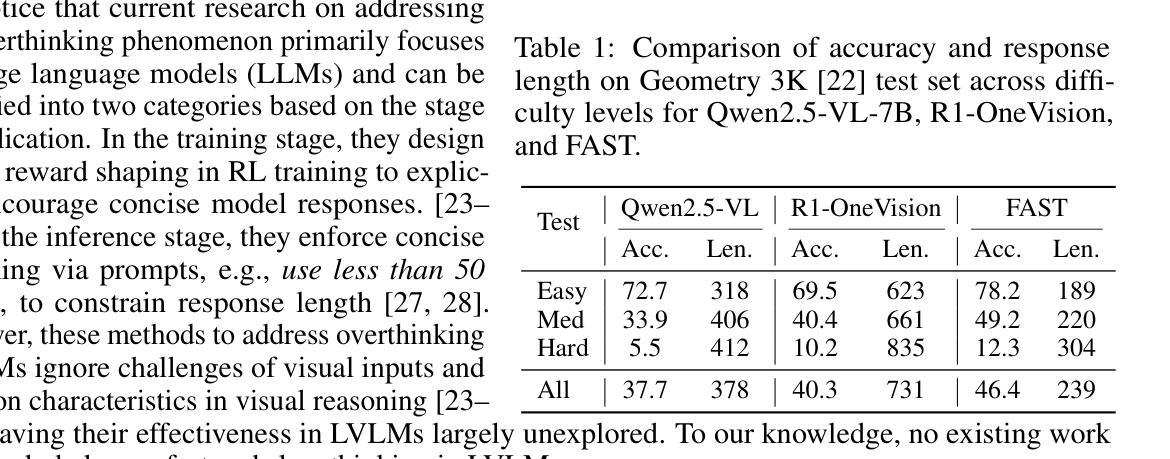 当使用强化学习(通常通过GRPO)对大型视觉语言模型进行推理时,面临着难以有效扩展推理长度的问题,或在所有任务中生成冗长的输出,而准确率只有微小的提高。为了解决这一问题,我们提出了FAST-GRPO,这是GRPO的一种变体,它根据问题的特性动态适应推理深度。通过实证分析,我们证明了快慢思维在LVLMs中的可行性,并研究了响应长度和数据分布如何影响性能。受这些观察的启发,我们引入了两种互补的指标来估计问题的难度,指导模型确定何时使用快速或慢速思维更为合适。接下来,我们将基于长度的自适应奖励和难度感知KL散度纳入GRPO算法。在七个推理基准测试上的实验表明,FAST实现了最先进的准确性,与基础模型相比,相对提高了10%以上,同时与之前的慢速思维方法相比,令牌使用量减少了32.7-67.3%,有效地平衡了推理长度和准确性。