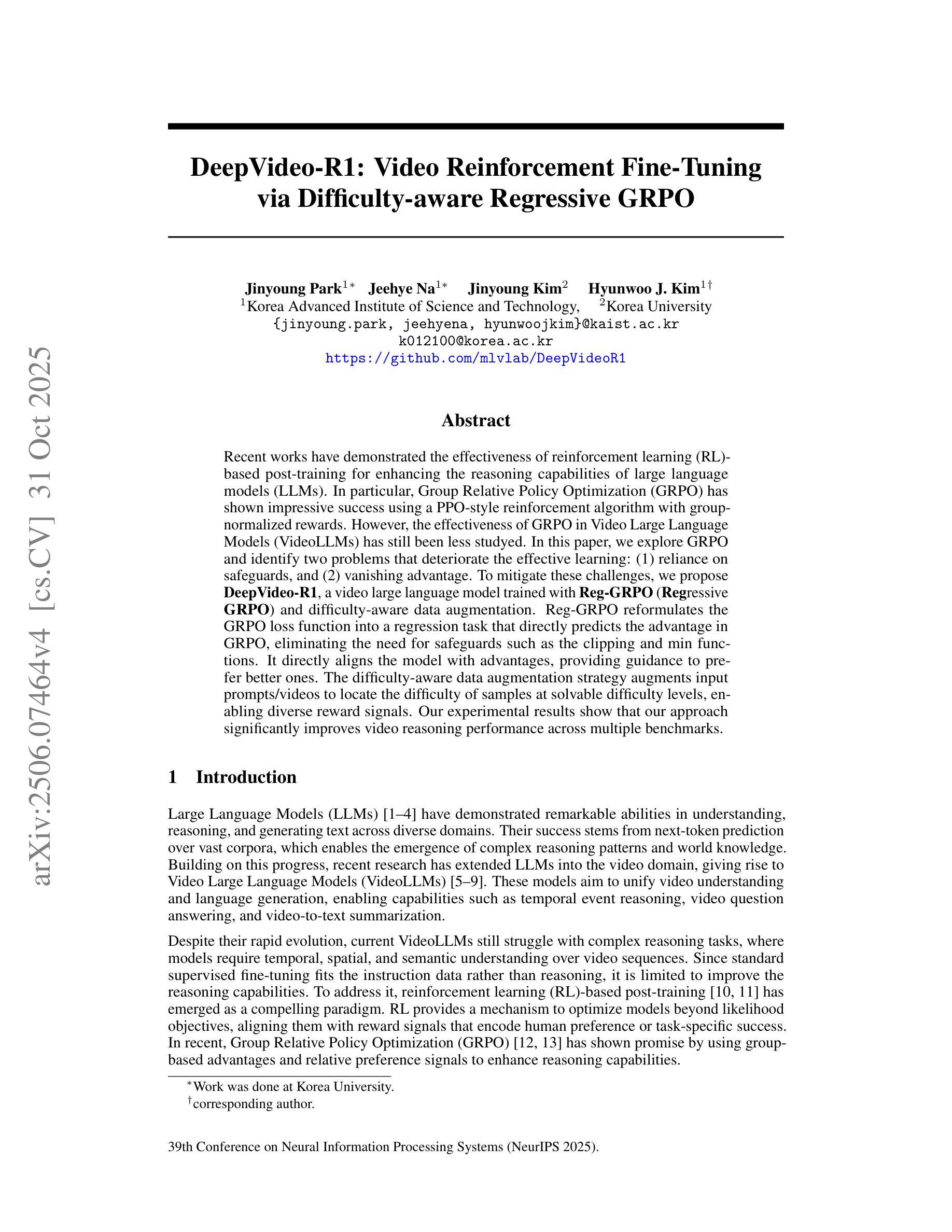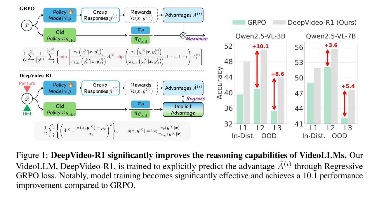 最近的研究工作展示了基于强化学习(RL)的训练后处理在提升大型语言模型(LLM)的推理能力方面的有效性。特别是,群组相对策略优化(GRPO)使用PPO风格的强化算法和群组归一化奖励,取得了令人印象深刻的成功。然而,GRPO在视频大型语言模型(VideoLLMs)中的有效性研究仍然较少。在本文中,我们探索了GRPO,并识别出两个导致学习效能下降的问题:(1)对保障措施的依赖;(2)优势消失。为了缓解这些挑战,我们提出了DeepVideo-R1,这是一种用回归GRPO(Reg-GRPO)和难度感知数据增强训练的视频大型语言模型。Reg-GRPO将GRPO损失函数重新定义为回归任务,直接预测GRPO中的优势,消除了对保障措施(如裁剪和最小函数)的需求。它直接使模型与优势对齐,为更好的模型提供指导。难度感知数据增强策略增加了输入提示/视频,以定位在可解决难度水平样本的难度,从而实现多样化的奖励信号。我们的实验结果表明,我们的方法在多基准测试中显著提高了视频推理性能。