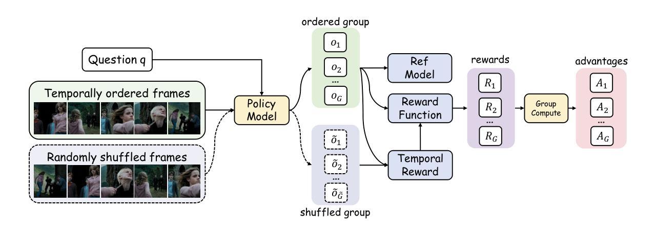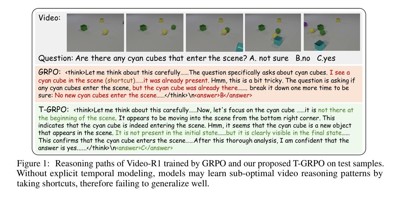 - 为解决这些问题,提出了T-GRPO算法,鼓励模型利用视频中的时间信息进行推理。