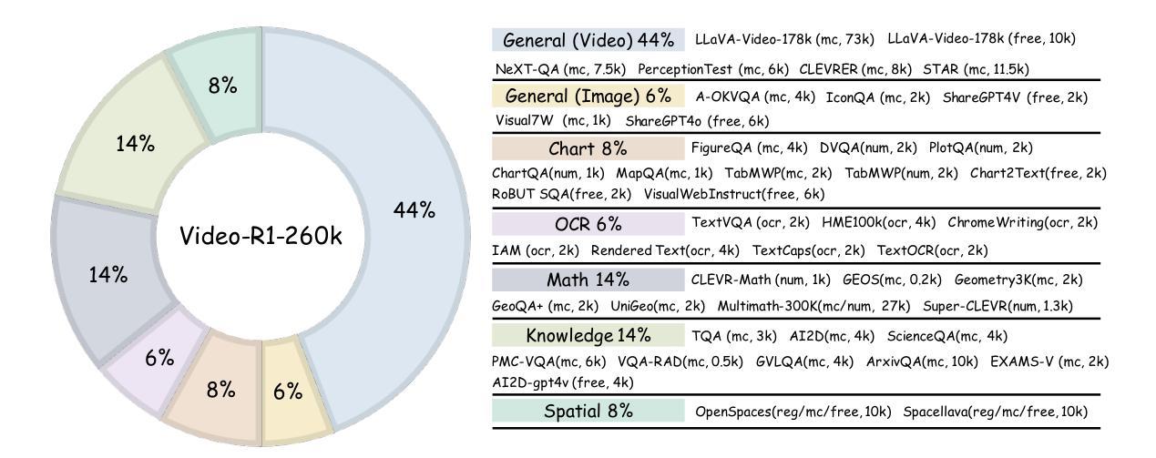 - 除了视频数据,还融入了高质量图像推理数据,构建了Video-R1-CoT-165k和Video-R1-260k数据集。