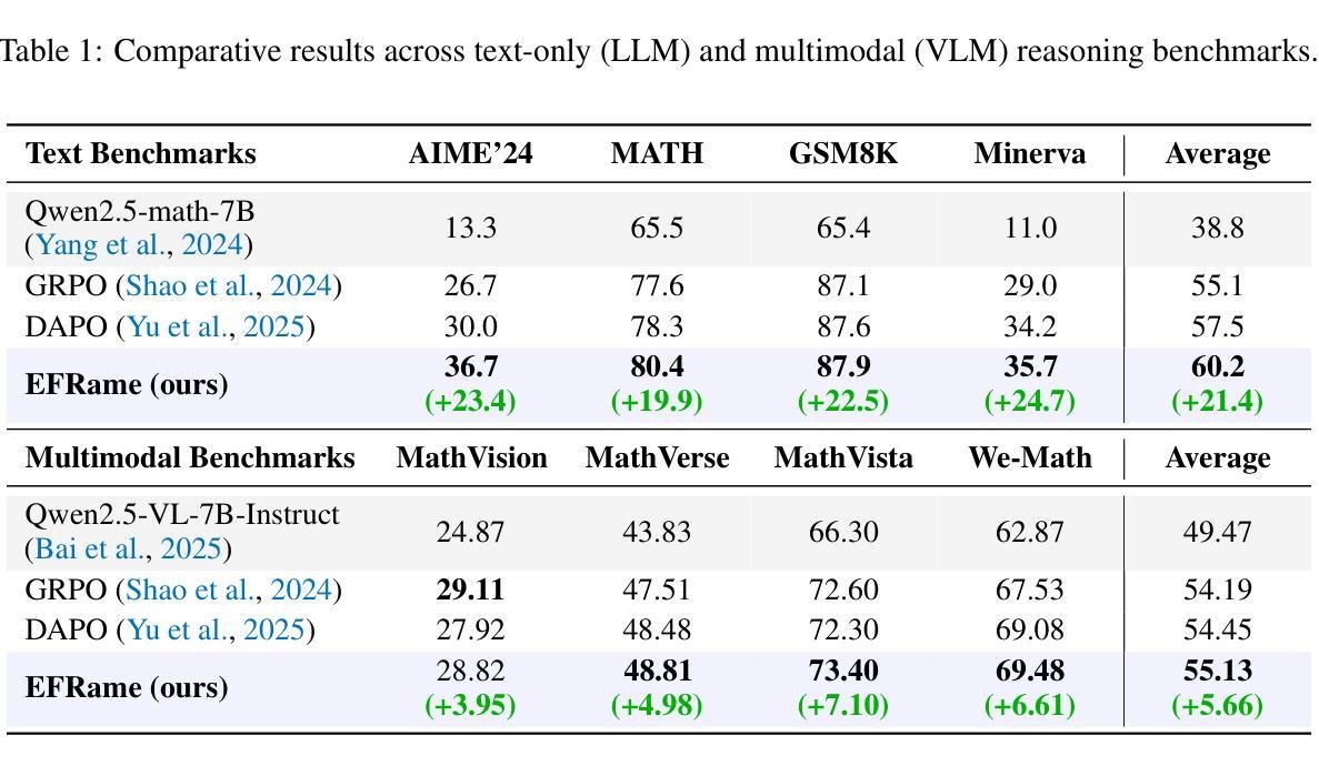 - EFRame在多种基准测试中表现优异,相较于GRPO有显著改进。