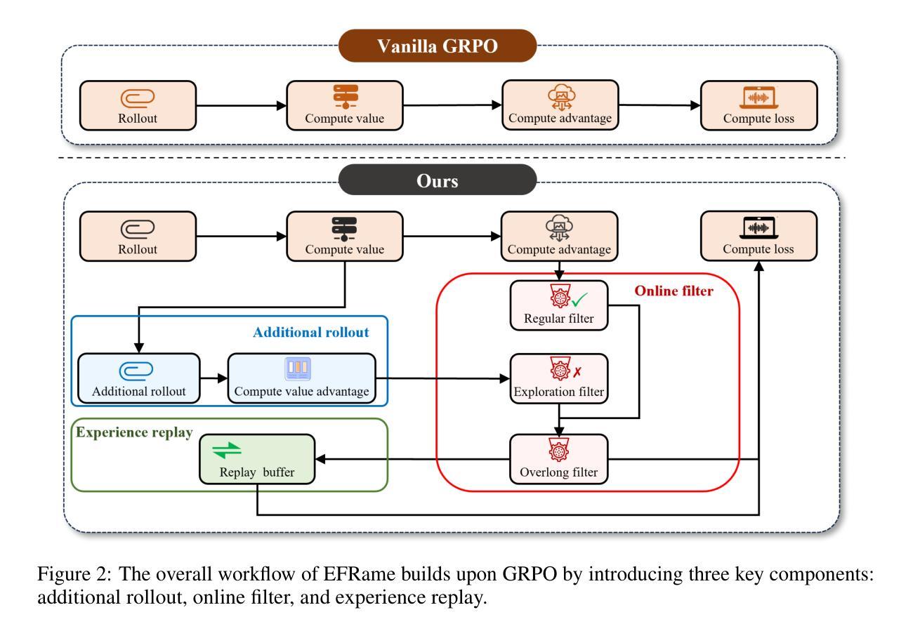 - EFRame框架实现了更深的探索,通过在线过滤和低质量样本移除稳定梯度,加速训练过程。