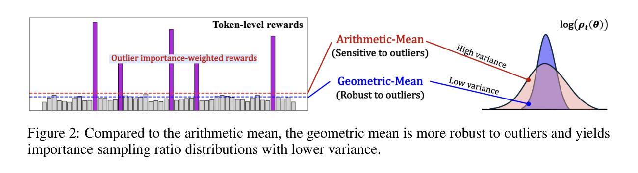 - 几何均值政策优化(GMPO)旨在通过最大化令牌级别奖励的几何平均值来提高GRPO的稳定性,对异常值具有更小的敏感性。