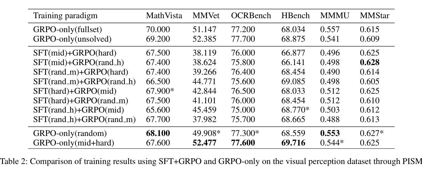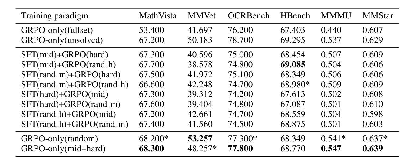 在Multimodal Large Language Models(MLLMs)的最新进展推动下,链式思维(CoT)推理取得了重大进展。基于Deepseek-R1的成功,研究者将多模态推理扩展到基于强化学习(RL)的后期训练模式,主要集中在数学数据集上。然而,现有的后期训练模式往往忽略了两个关键方面:(1)缺乏可量化的难度指标,无法为后期训练优化策略性地筛选样本。(2)次优的后期训练模式无法同时优化感知和推理能力。为了弥补这一空白,我们提出了两种新的难度感知采样策略:渐进图像语义掩蔽(PISM)通过系统图像退化量化样本难度,而跨模态注意力平衡(CMAB)则通过注意力分布分析评估跨模态交互复杂性。利用这些指标,我们设计了一个分层训练框架,该框架结合了仅使用GRPO和SFT+GRPO混合训练模式,并在六个基准数据集上进行了评估。实验表明,与常规SFT+GRPO管道相比,应用于难度分层样本的GRPO表现更优越且一致,这表明战略数据采样可以取代监督微调的需要,同时提高模型准确性。我们的代码将在https://github.com/qijianyu277/DifficultySampling上发布。