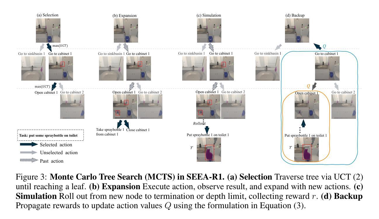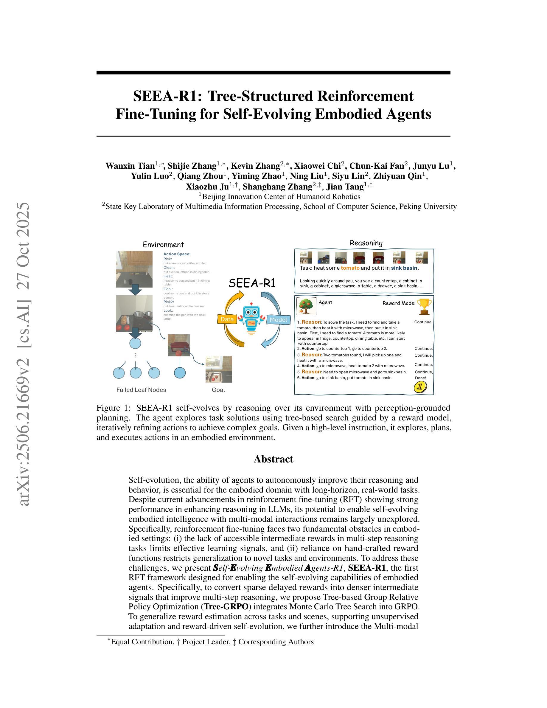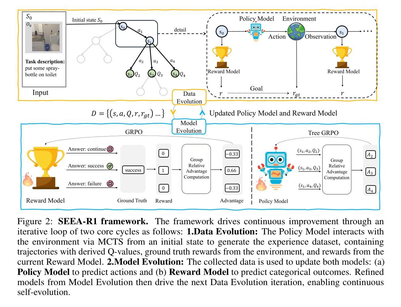 自我进化,即智能体自主提高其推理和行为的能力,对于具有长远视野和现实世界任务的具体领域至关重要。尽管强化微调(RFT)的当前进展在增强大型语言模型(LLM)的推理能力方面表现出强大的性能,但其实现具有多模态交互的自我进化智能的潜力仍被大量探索。具体来说,强化微调在面对具体领域时面临两大基本障碍:(i)多步推理任务中缺乏可访问的中间奖励限制了有效的学习信号;(ii)对手动设计奖励函数的依赖限制了其在新型任务和环境中的泛化能力。针对这些挑战,我们提出了自我进化实体代理-R1,即SEEA-R1,这是第一个旨在实现实体代理自我进化能力的强化微调框架。具体来说,为了将稀疏的延迟奖励转化为更密集的中间信号,以提高多步推理能力,我们提出了基于树的群体相对策略优化(Tree-GRPO),它将蒙特卡洛树搜索整合到GRPO中。为了对任务和场景进行泛化的奖励估计,支持自主适应和奖励驱动的自我进化,我们进一步引入了多模态生成奖励模型(MGRM)。为了全面评估SEEA-R1的有效性,我们在ALFWorld基准测试上进行了评估,超越了最先进的方法,达到了文本类85.07%和多模态类46.27%的成绩,超越了包括GPT-4o在内的先前模型。SEEA-R1在不使用真实奖励的情况下还实现了文本类80.3%和多模态类44.03%的成绩,超越了所有开源基准测试,突显了其作为自我进化实体代理的可扩展性。额外的实验和定性分析进一步支持SEEA-R1在未来可扩展智能领域的研究潜力。