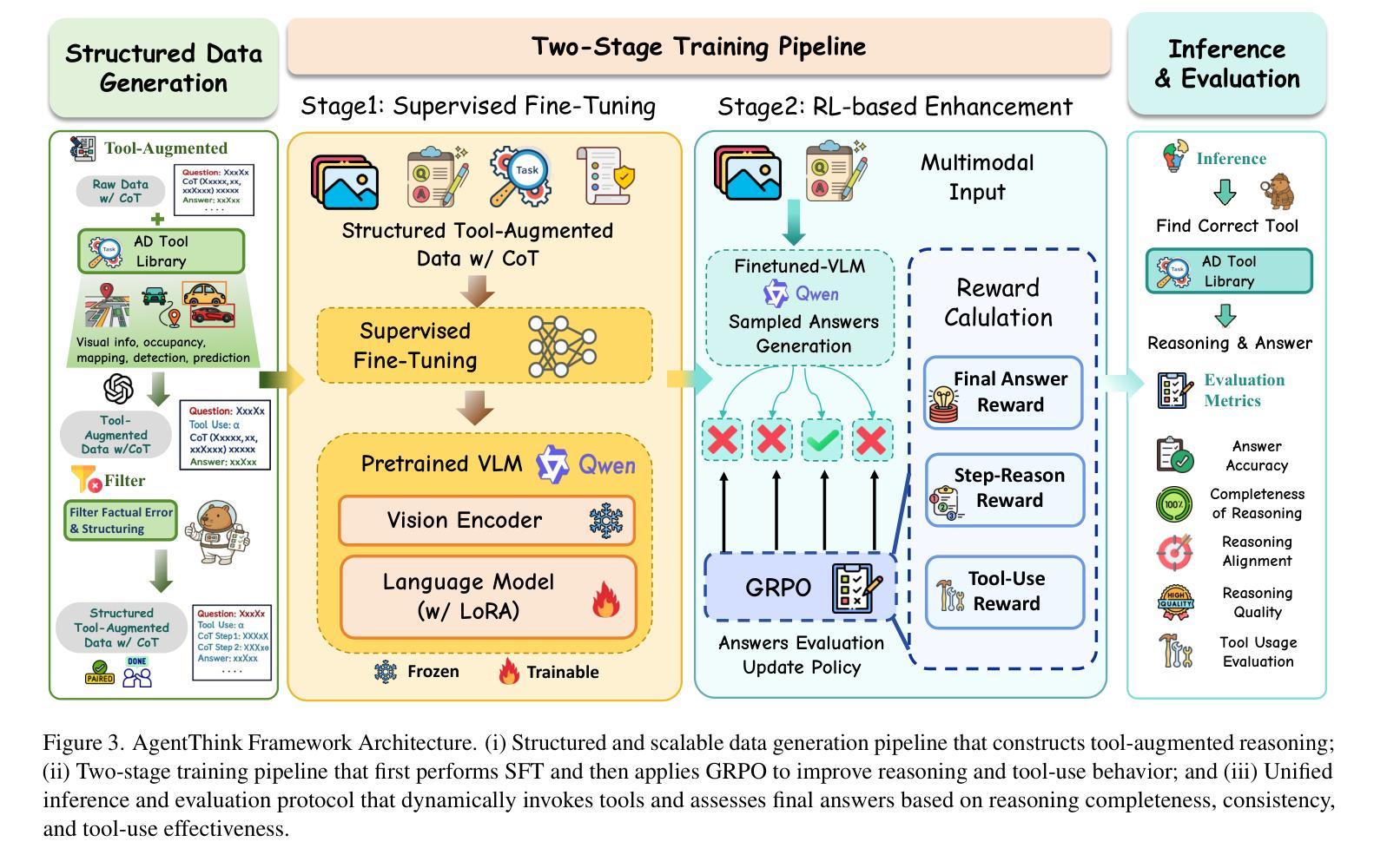 - AgentThink的核心创新包括结构化数据生成、两阶段训练管道以及新颖的评估协议,用于评估模型在多种驾驶场景中的工具调用和使用能力。