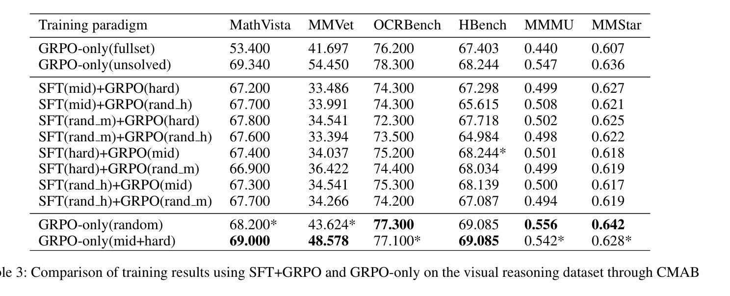 - 实验结果显示GRPO在难度分层样本上具有优势,超越了传统的SFT+GRPO管道。