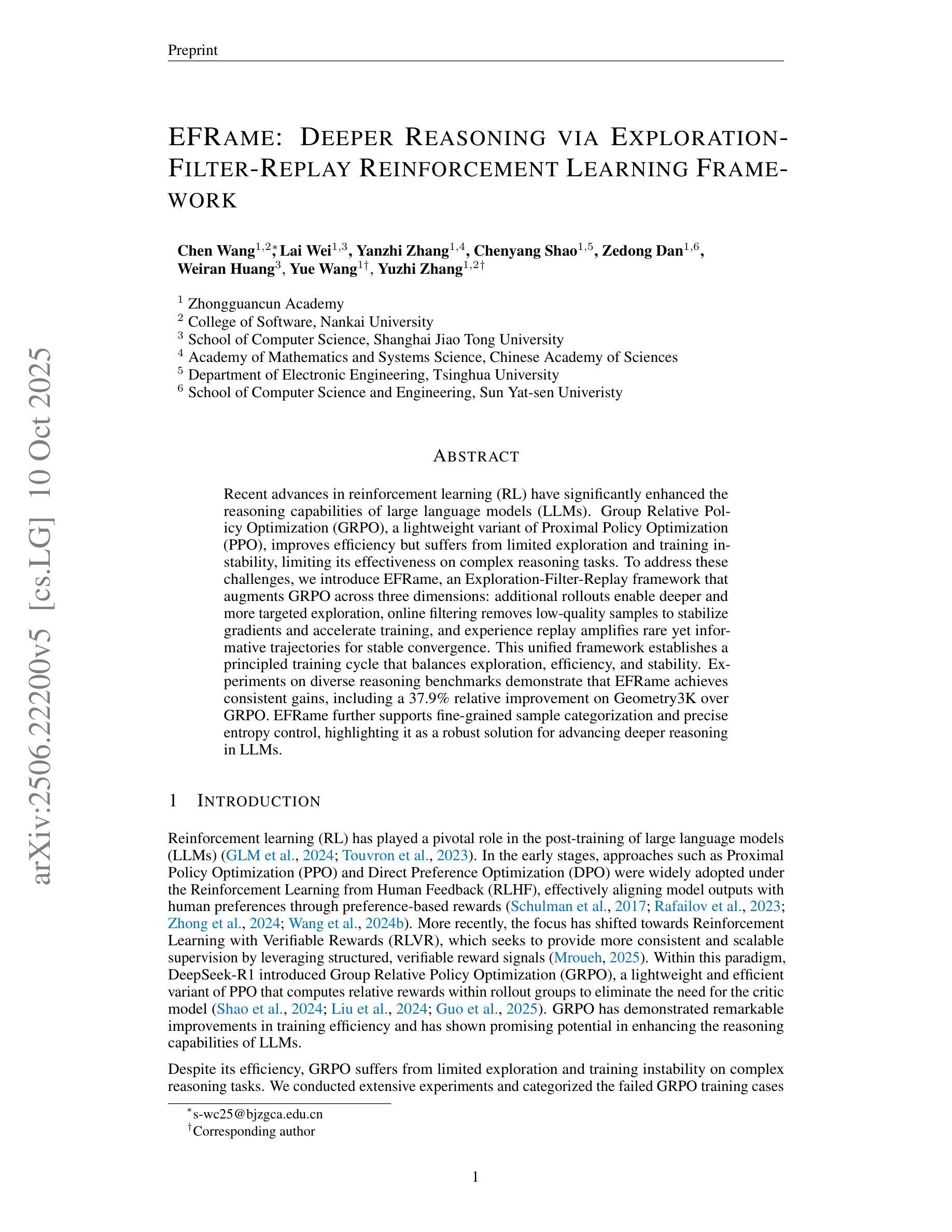 强化学习在提升大型语言模型的推理能力方面取得了重要进展。然而,Group Relative Policy Optimization(GRPO)在处理复杂推理任务时面临有限探索和训练不稳定的问题。为解决这些问题,我们提出了EFRame框架,该框架从三个维度对GRPO进行了增强:额外的rollouts实现更深更精准的探索,在线过滤移除低质量样本以稳定梯度并加速训练,经验回放放大稀有但重要的轨迹以实现稳定收敛。实验证明,EFRame在多种推理基准测试中表现优异,相对于GRPO有显著改善,如在Geometry3K上相对提升了37.9%。该框架支持精细样本分类和精确熵控制,展现了其在推动大型语言模型深度推理方面的稳健性。相关代码已发布在GitHub上。