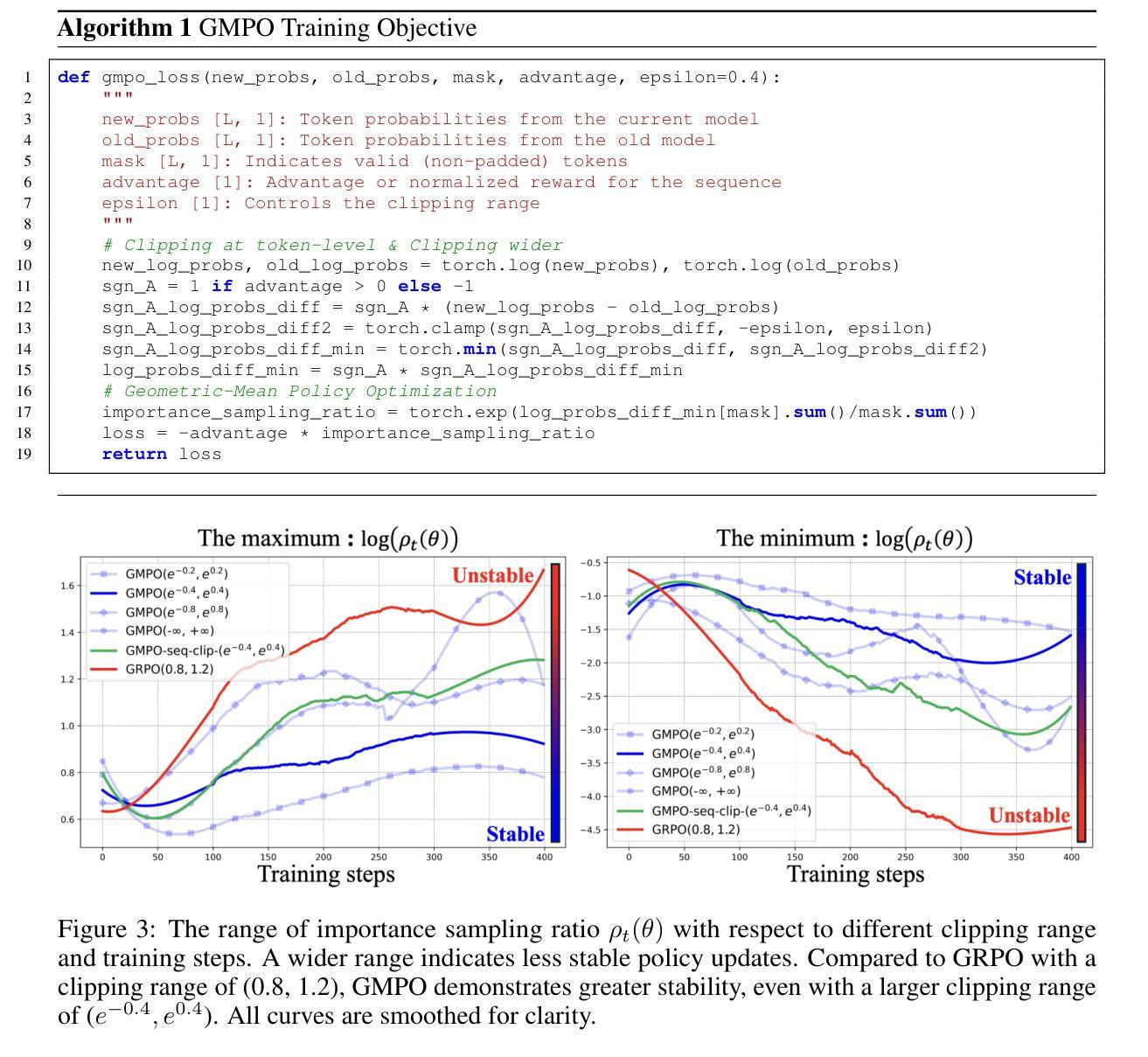- GMPO 能维持更稳定的重要性采样比率范围,并通过替换GRPO中的算术平均值为几何平均值来实施。