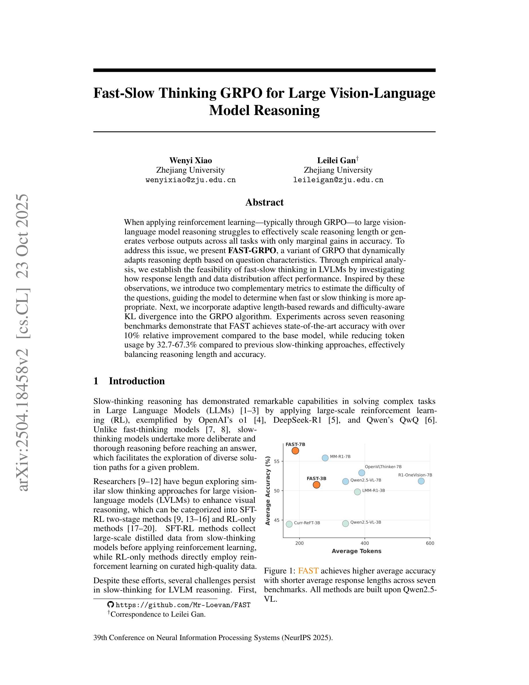 在大型视觉语言模型中,应用强化学习(通常通过GRPO实现)进行推理时,存在推理长度难以有效扩展或输出过于冗长的问题,且准确度仅略有提升。为解决这一问题,我们提出了FAST-GRPO方法,这是一种能根据问题特性动态调整推理深度的GRPO变体。通过实证研究,我们证明了快慢思考的可行性,并发现响应长度和数据分布对性能的影响。基于此观察,我们引入了两种互补指标来评估问题的难度,指导模型判断何时采用快速或慢速思考更为合适。接着,我们将基于长度的自适应奖励和难度感知KL散度融入GRPO算法。在七个推理基准测试上的实验表明,FAST方法实现了最先进的准确性,相对于基础模型有超过10%的相对改进,同时相比之前的慢速思考方法减少了32.7-67.3%的令牌使用量,有效地平衡了推理长度和准确性。