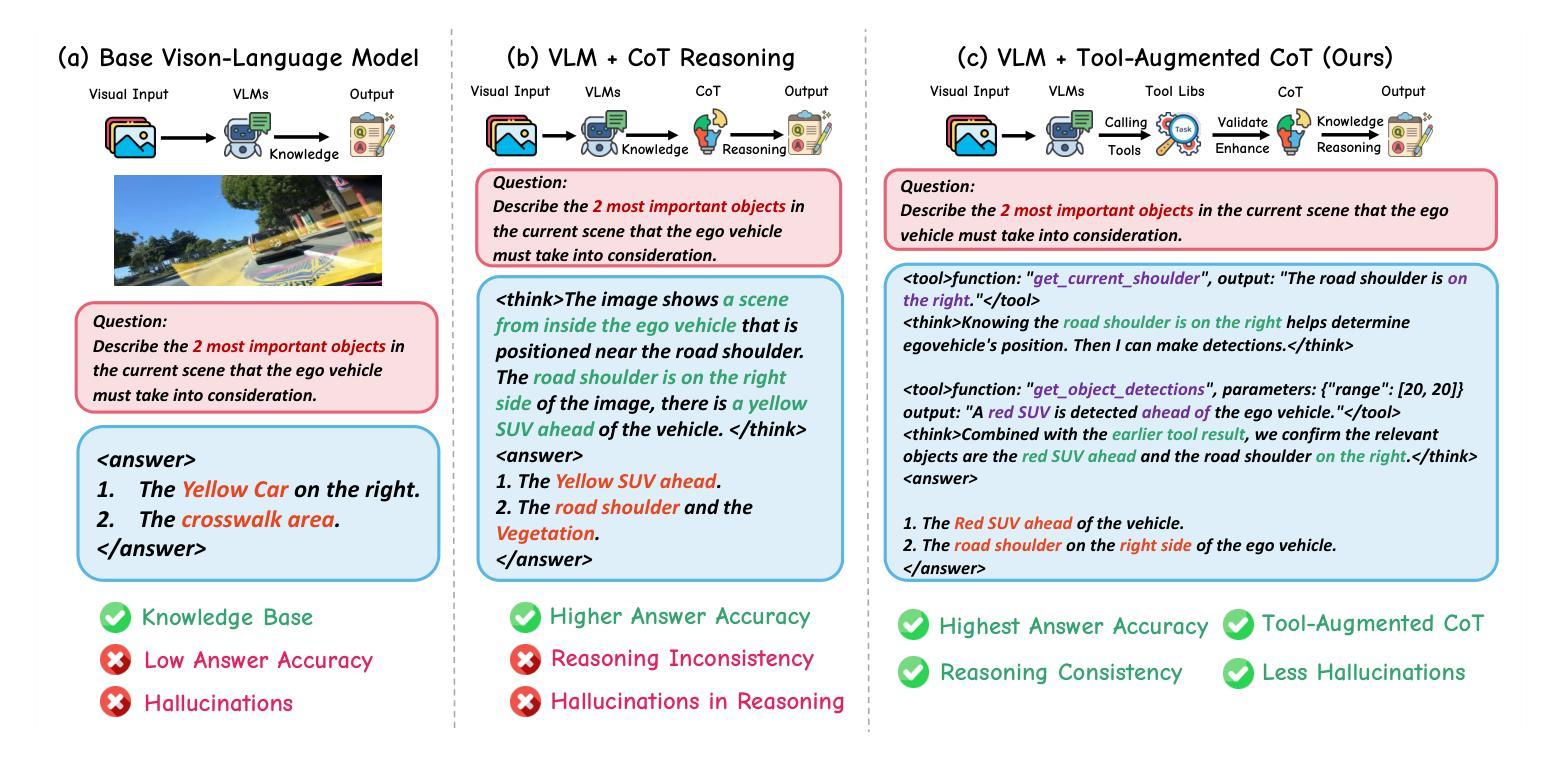 本文介绍了针对自动驾驶领域视觉语言模型(VLMs)存在的局限而提出的一种名为AgentThink的统一框架。该框架结合了链式思维(CoT)推理与动态工具调用技术,以提高VLMs的感知准确性和逐步推理的稳健性。AgentThink的核心创新包括结构化数据生成、两阶段训练管道和工具使用评估协议。实验表明,AgentThink显著提高了推理得分和答案准确性,并改善了推理质量和一致性。