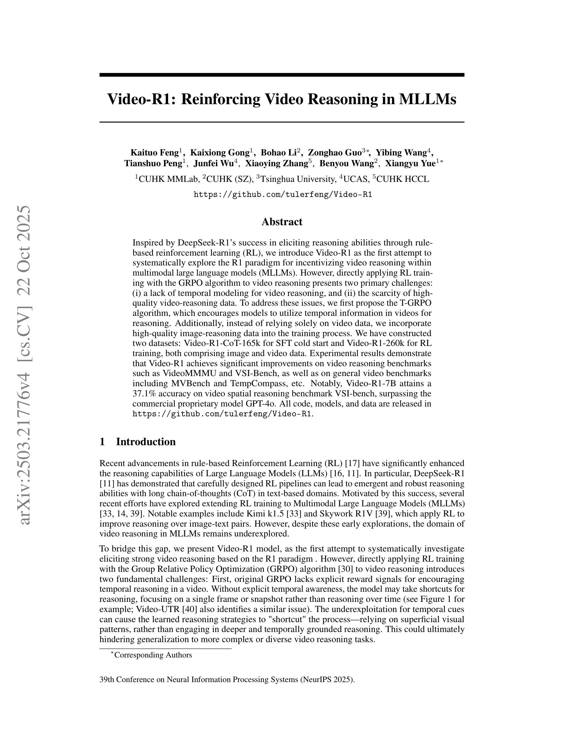Inspired by DeepSeek-R1’s success in eliciting reasoning abilities through rule-based reinforcement learning (RL), we introduce Video-R1 as the first attempt to systematically explore the R1 paradigm for incentivizing video reasoning within multimodal large language models (MLLMs). However, directly applying RL training with the GRPO algorithm to video reasoning presents two primary challenges: (i) a lack of temporal modeling for video reasoning, and (ii) the scarcity of high-quality video-reasoning data. To address these issues, we first propose the T-GRPO algorithm, which encourages models to utilize temporal information in videos for reasoning. Additionally, instead of relying solely on video data, we incorporate high-quality image-reasoning data into the training process. We have constructed two datasets: Video-R1-CoT-165k for SFT cold start and Video-R1-260k for RL training, both comprising image and video data. Experimental results demonstrate that Video-R1 achieves significant improvements on video reasoning benchmarks such as VideoMMMU and VSI-Bench, as well as on general video benchmarks including MVBench and TempCompass, etc. Notably, Video-R1-7B attains a 37.1% accuracy on video spatial reasoning benchmark VSI-bench, surpassing the commercial proprietary model GPT-4o. All code, models, and data are released in: https://github.com/tulerfeng/Video-R1.