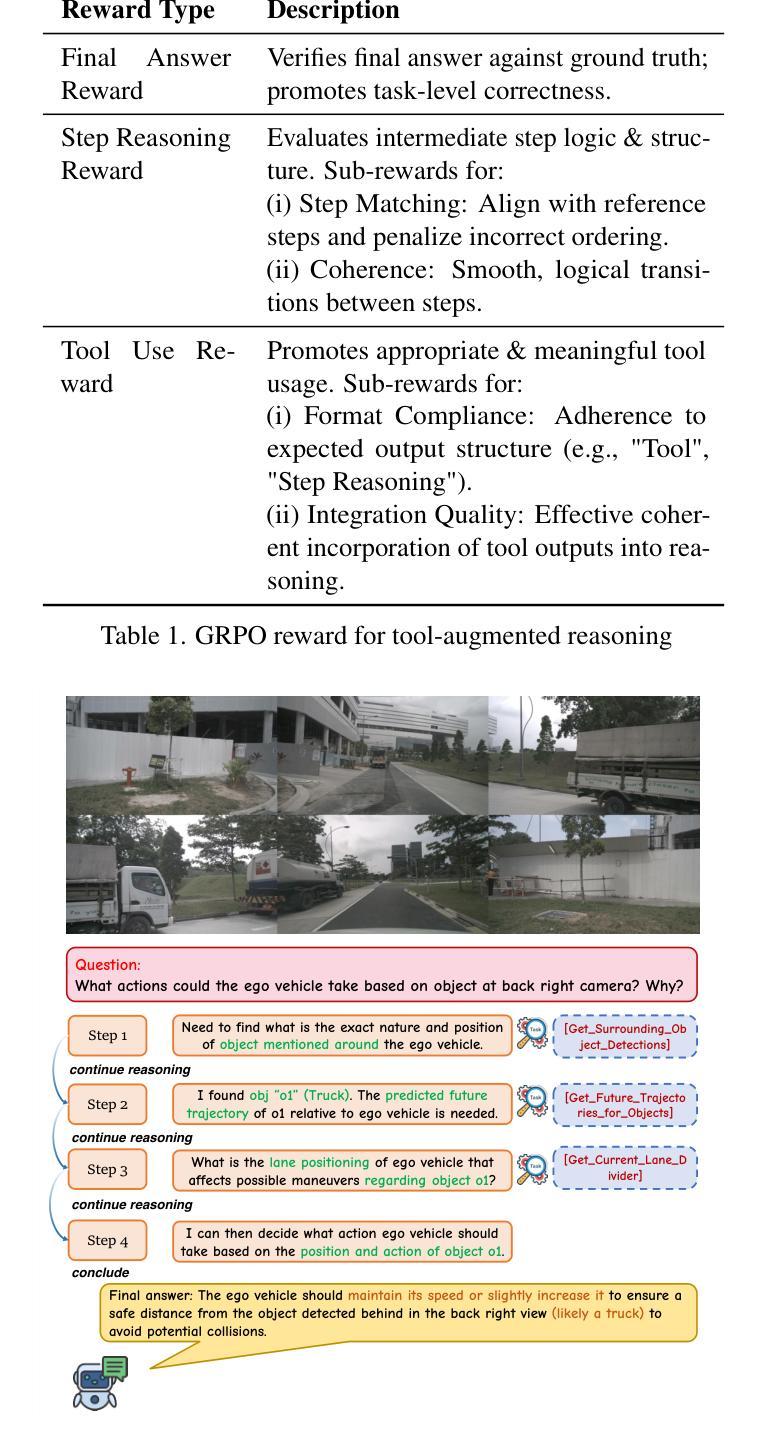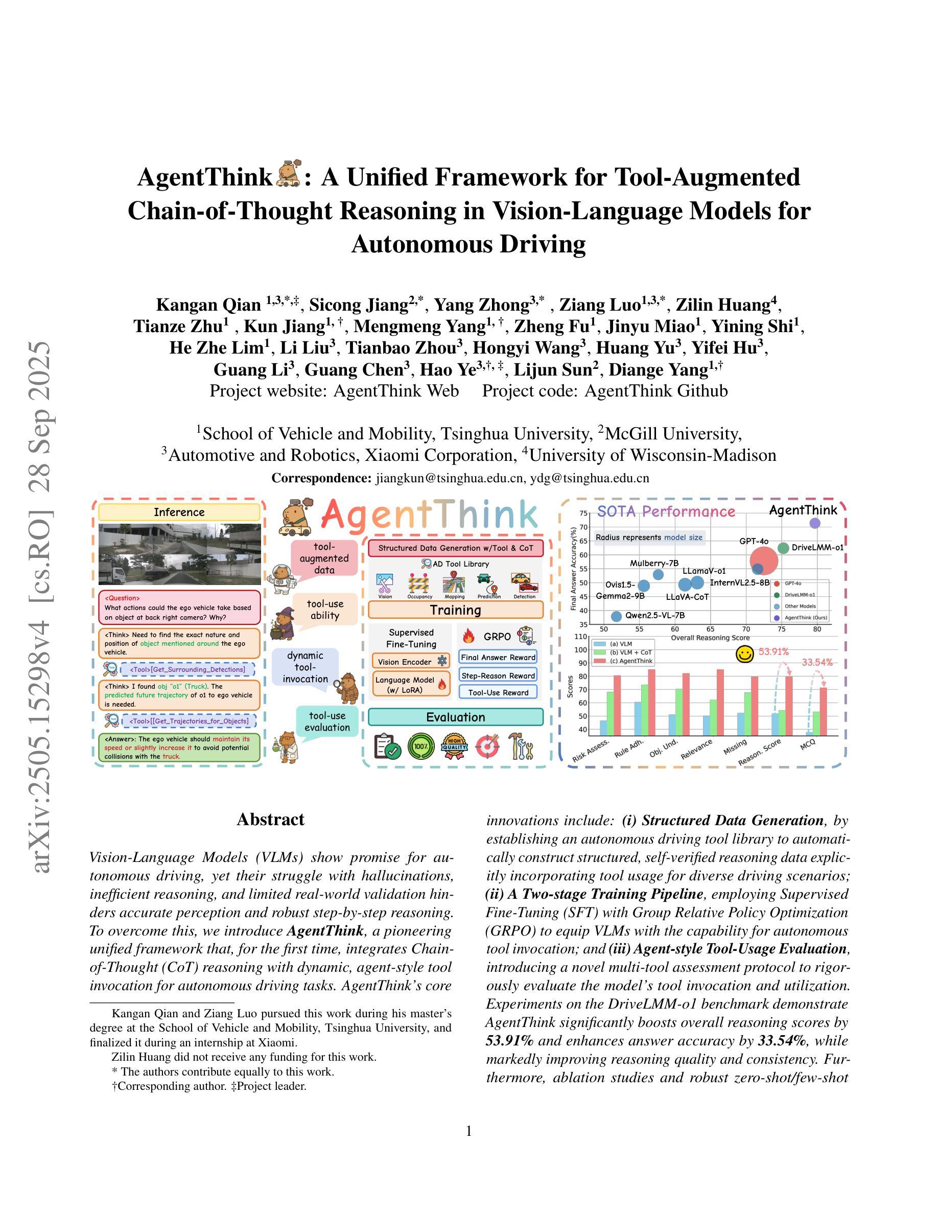 视觉语言模型(VLMs)在自动驾驶领域显示出巨大的潜力,然而它们所面临的幻觉、推理效率低下和现实世界验证有限等问题阻碍了准确的感知和稳健的逐步推理。为了克服这一问题,我们引入了AgentThink,这是一个开创性的统一框架,它将思维链(CoT)推理与动态、代理式工具调用相结合,用于自动驾驶任务。AgentThink的核心创新包括:(i)结构化数据生成,建立自动驾驶工具库,自动构建结构化、自我验证的推理数据,明确融入各种驾驶场景的工具使用;(ii)两阶段训练管道,采用监督微调(SFT)和群组相对策略优化(GRPO),使VLMs具备自主工具调用的能力;(iii)代理式工具使用评估,引入一种新的多工具评估协议,严格评估模型的工具调用和使用情况。在DriveLMM-o1基准测试上的实验表明,AgentThink整体推理得分提高了**53.91%,答案准确性提高了33.54%**,同时显著提高了推理质量和一致性。此外,消融研究和在各种基准测试上的稳健零样本/少样本泛化实验突显了其强大的能力。这些发现为我们开发可信且工具感知的自动驾驶模型指明了有希望的路径。代码可在https://github.com/curryqka/AgentThink处获取。
