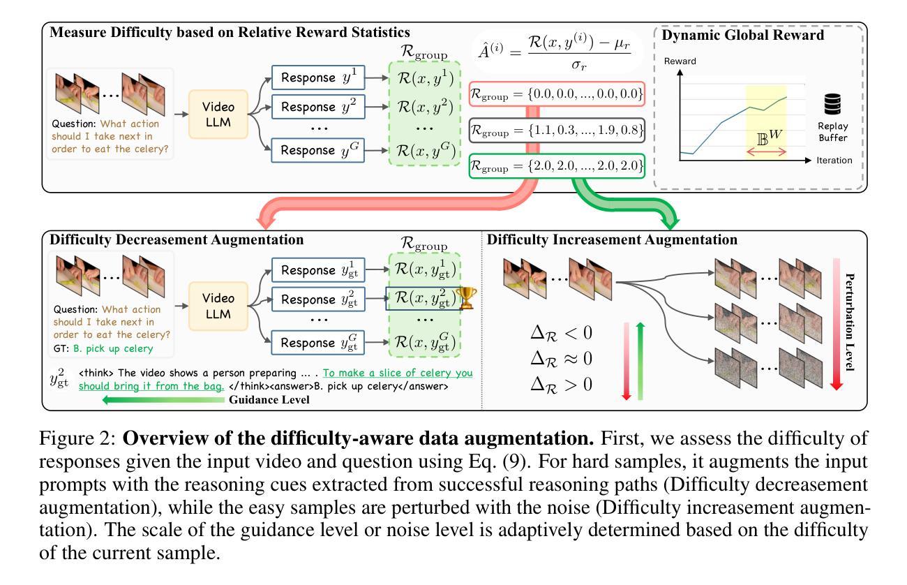- 难度感知数据增强策略可以提高输入提示/视频的难度,使其处于可解决水平。